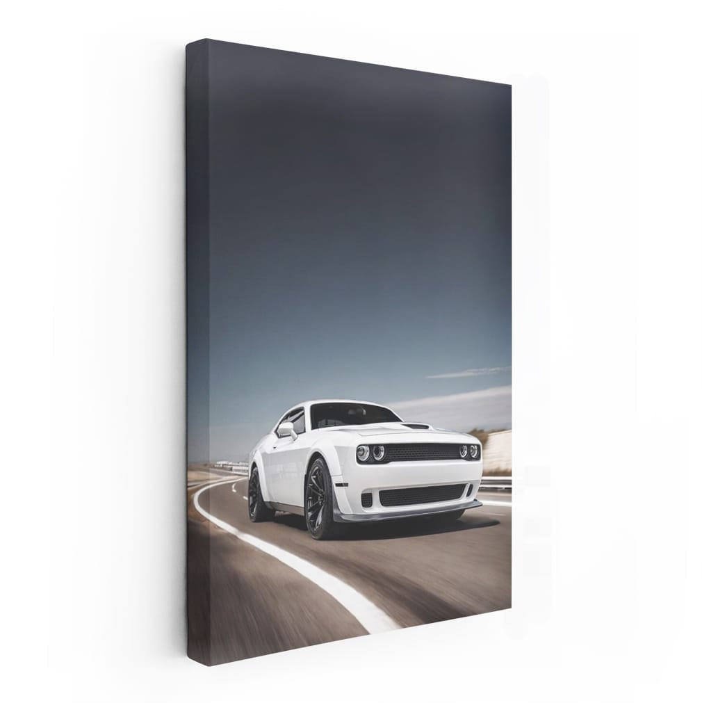 This is a poster for real car fans - a white Dodge rushes along the road like a beast, breaking away from the gray mass. A painting for those who live for speed and adrenaline. Such wall art will be a great accent in a garage or workshop. See more from the collection: Dodge Art