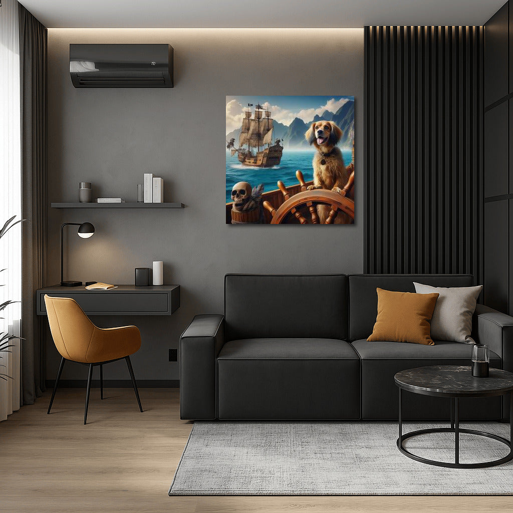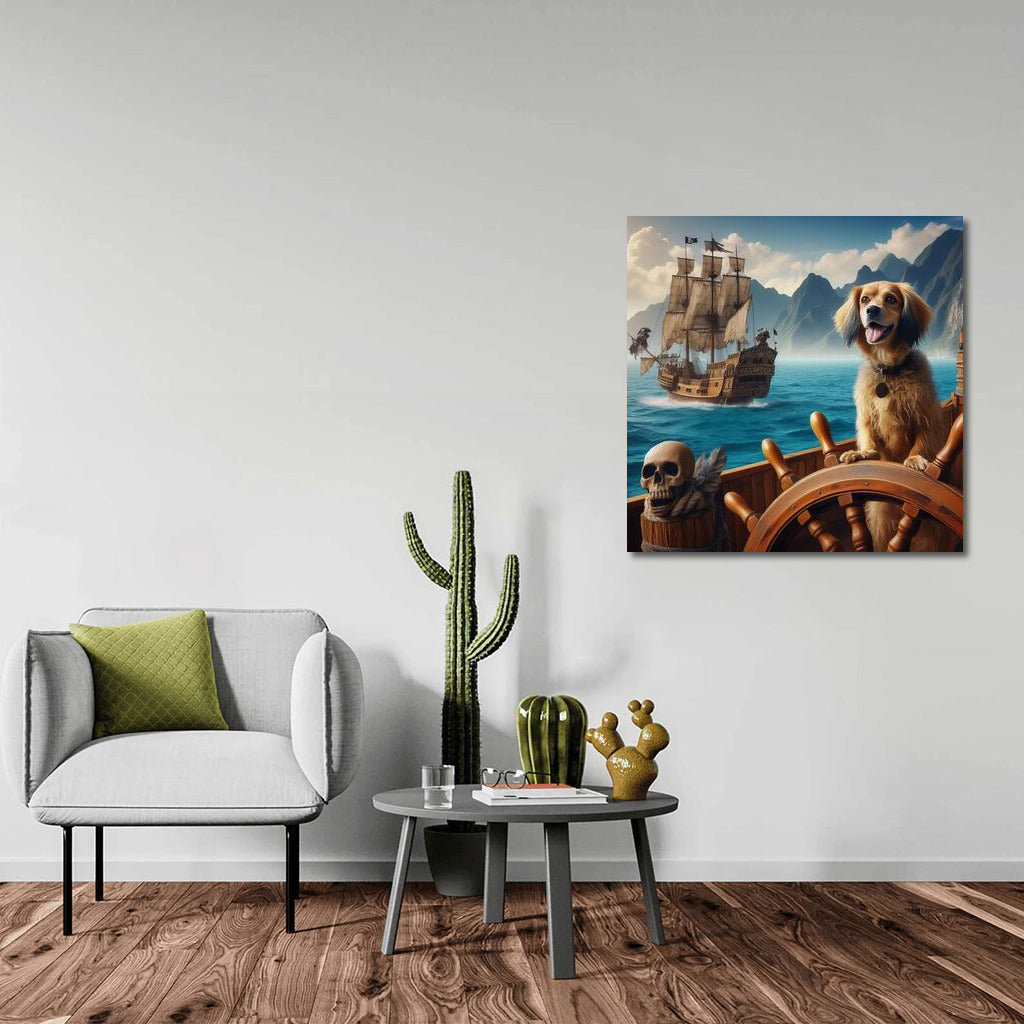 Dive into an adventure with this wall art: a dog is the captain of a pirate ship off the coast of a mysterious treasure island! ?☠️? See more from the collection: Animals Art