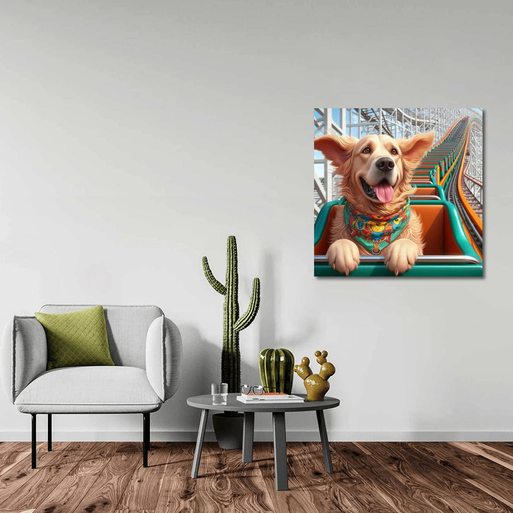 Immerse yourself in joy with this poster of a dog enjoying a roller coaster ride. Perfect wall art for fun! See more from the collection: Animals Art