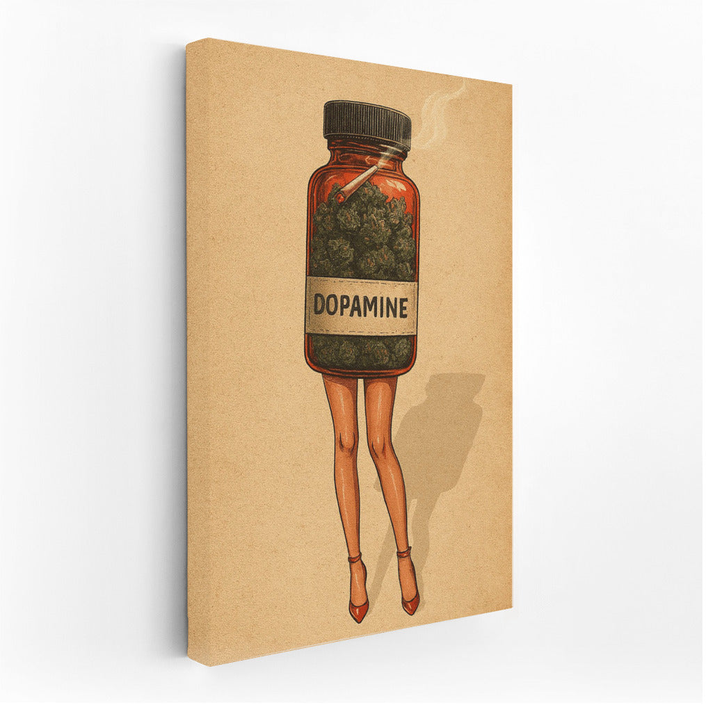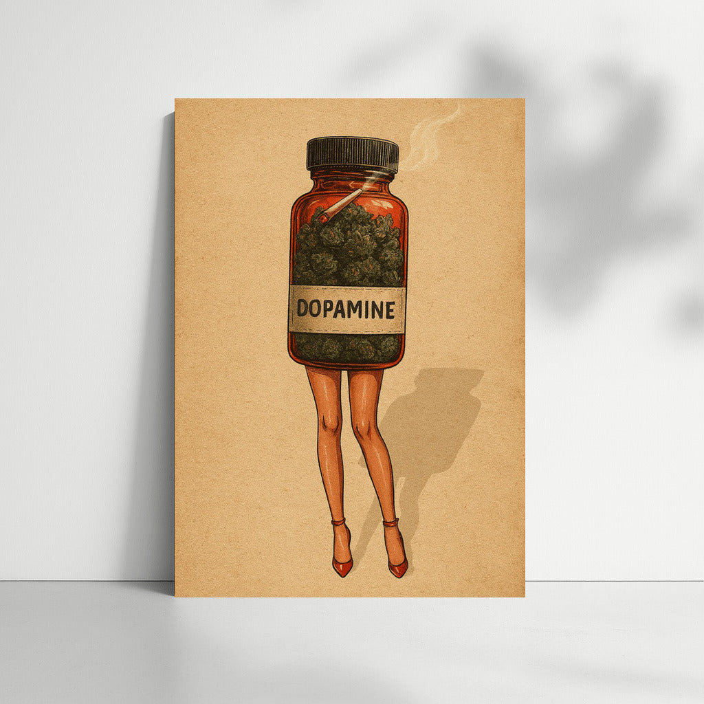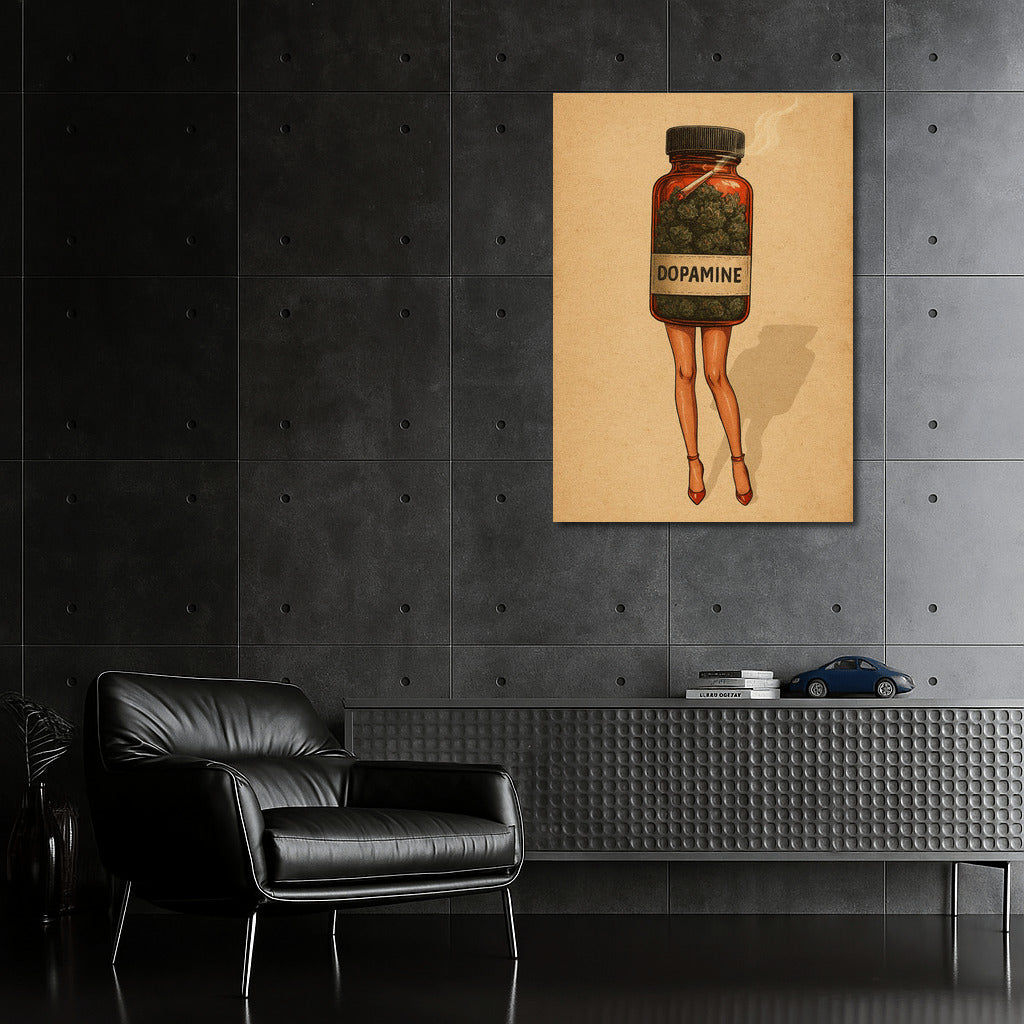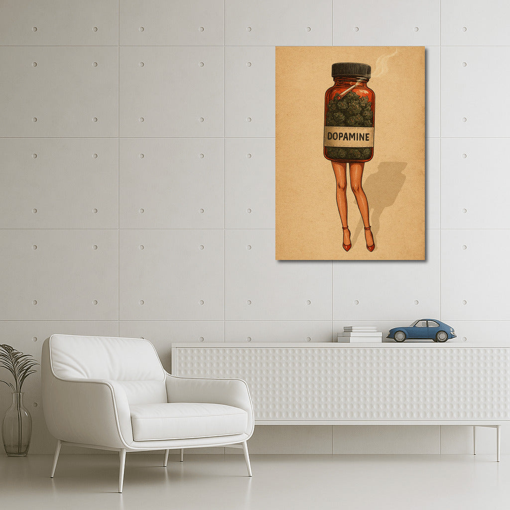 Wall art: Dopamine bottle with legs. Play with perception and the feeling of freedom. The perfect poster for your space! See more from the collection: Cannabis Art