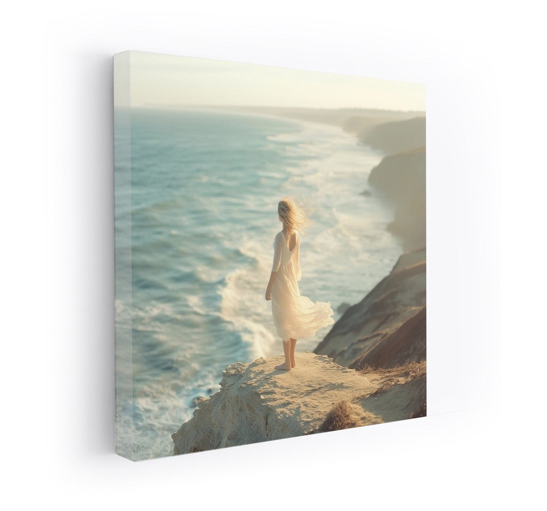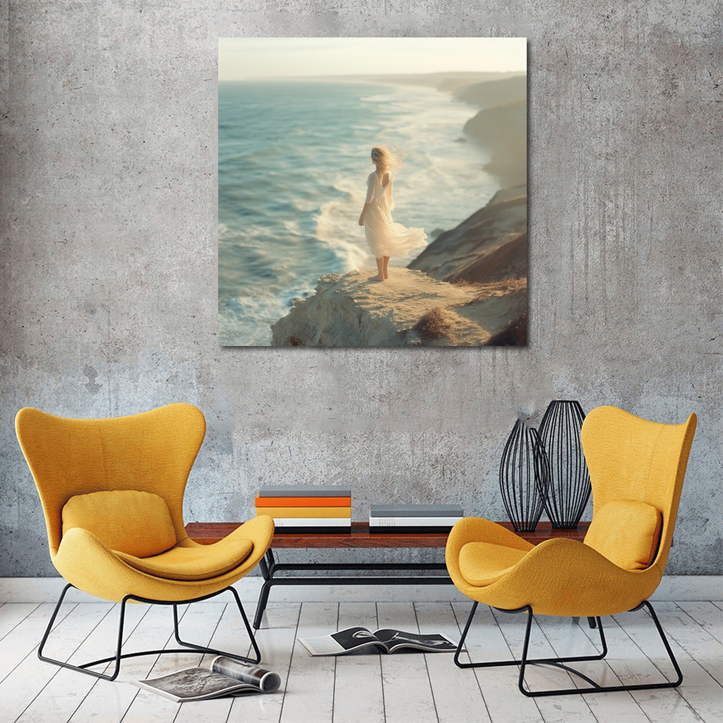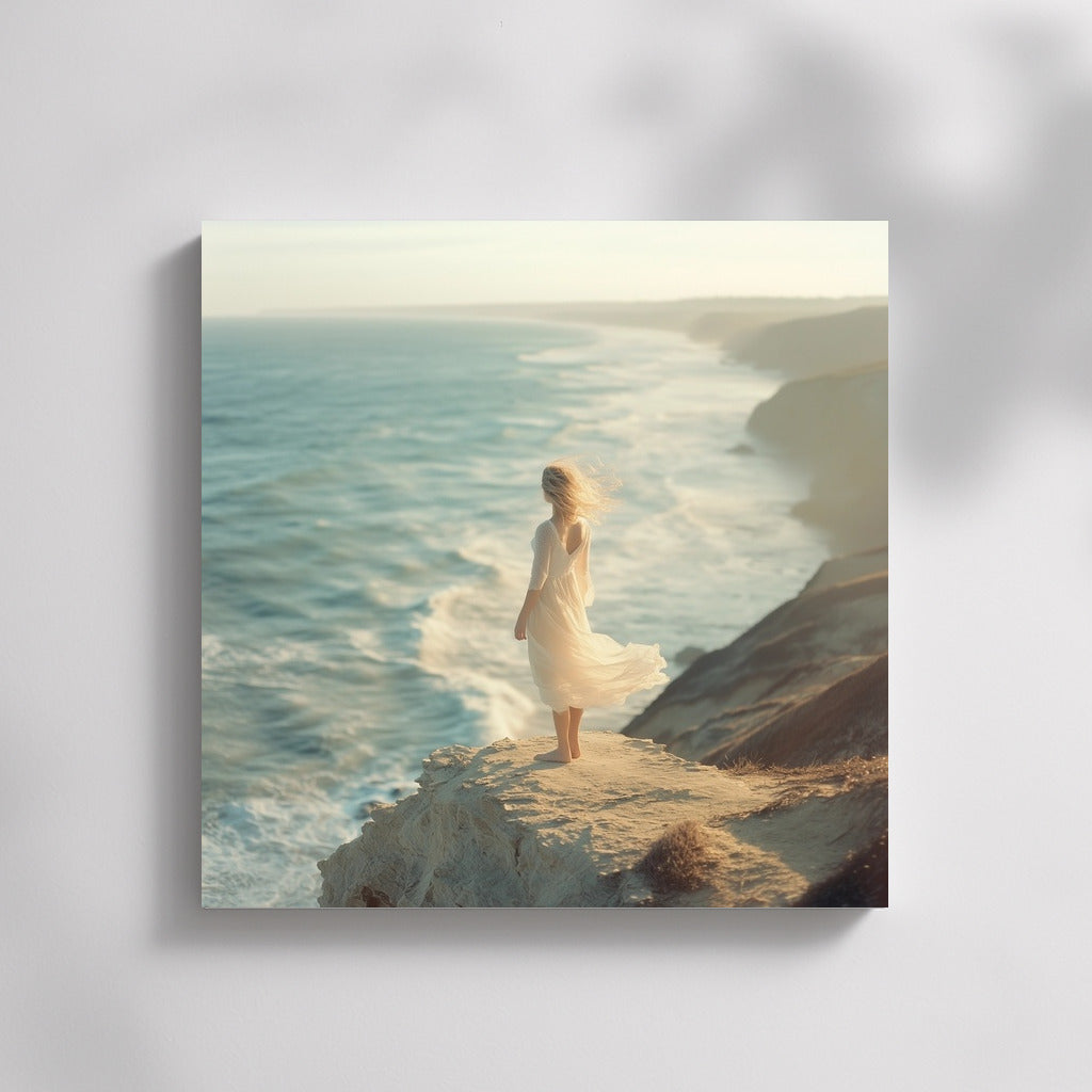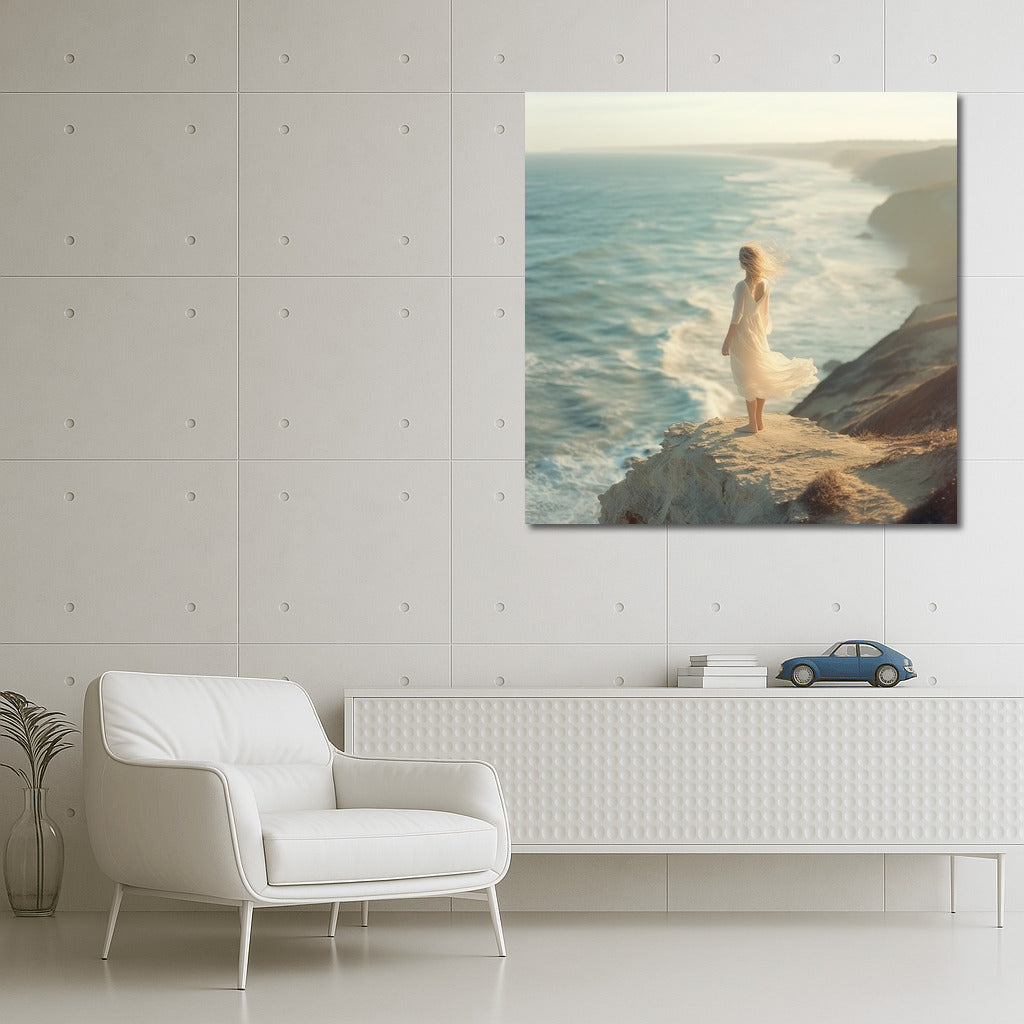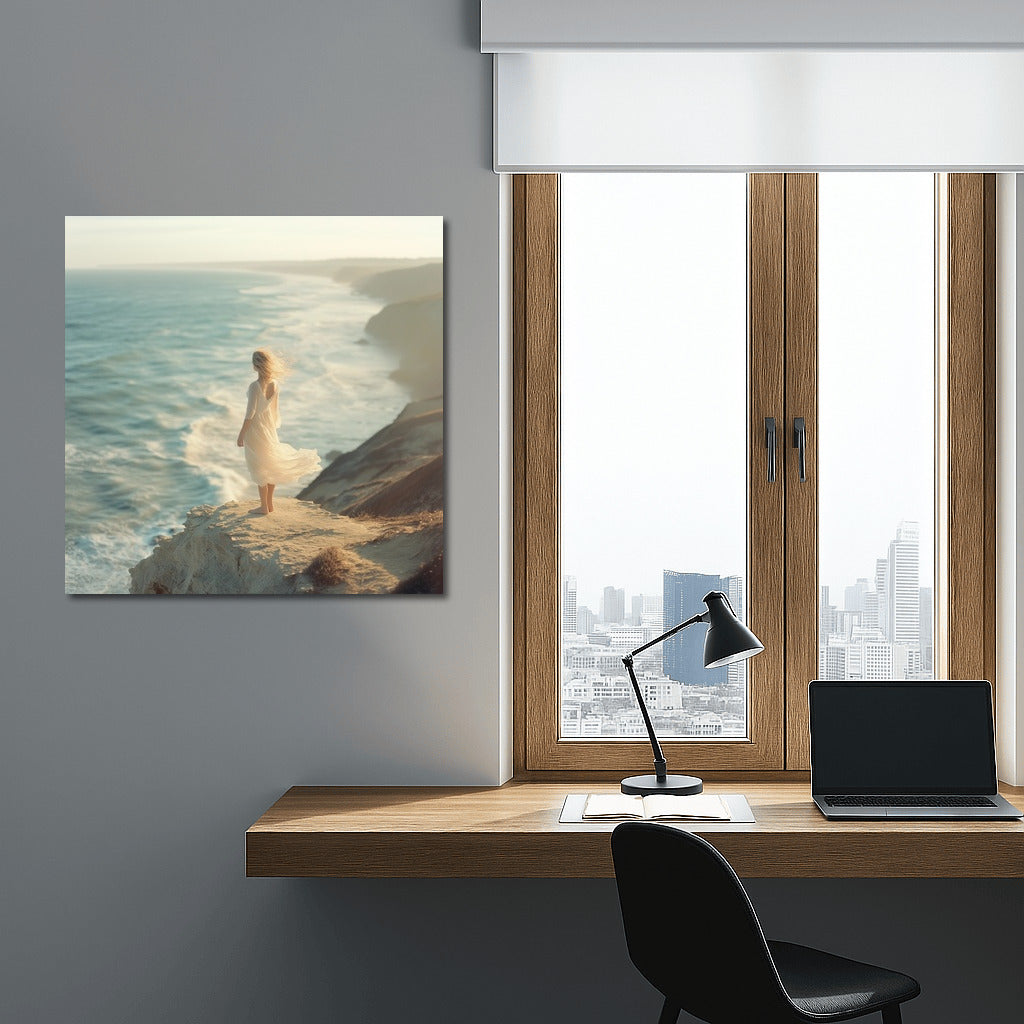 An ephemeral figure on a rock by the ocean. The painting evokes dreams. A perfect poster for creating atmospheric wall art. See more from the collection: Mixed Wall Art