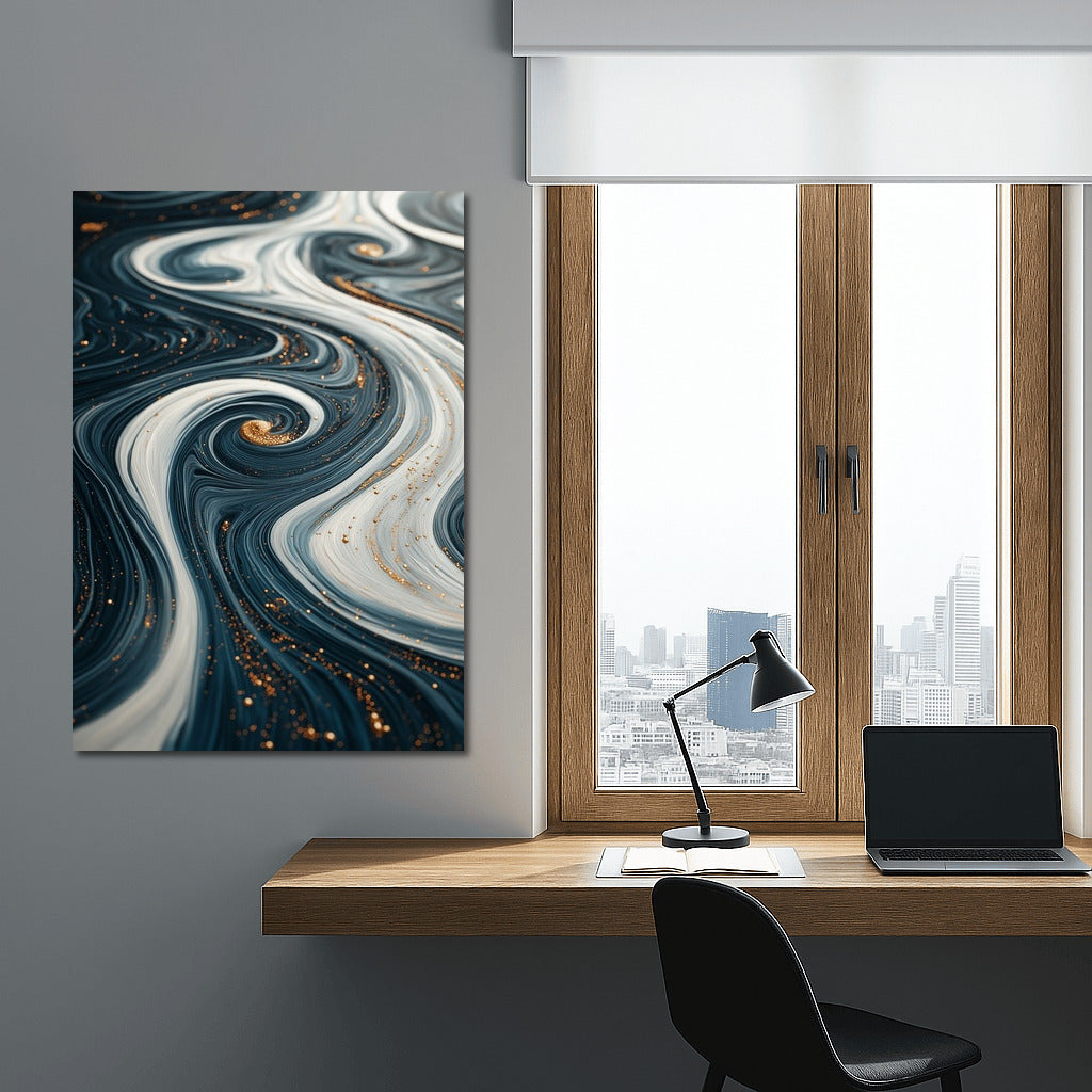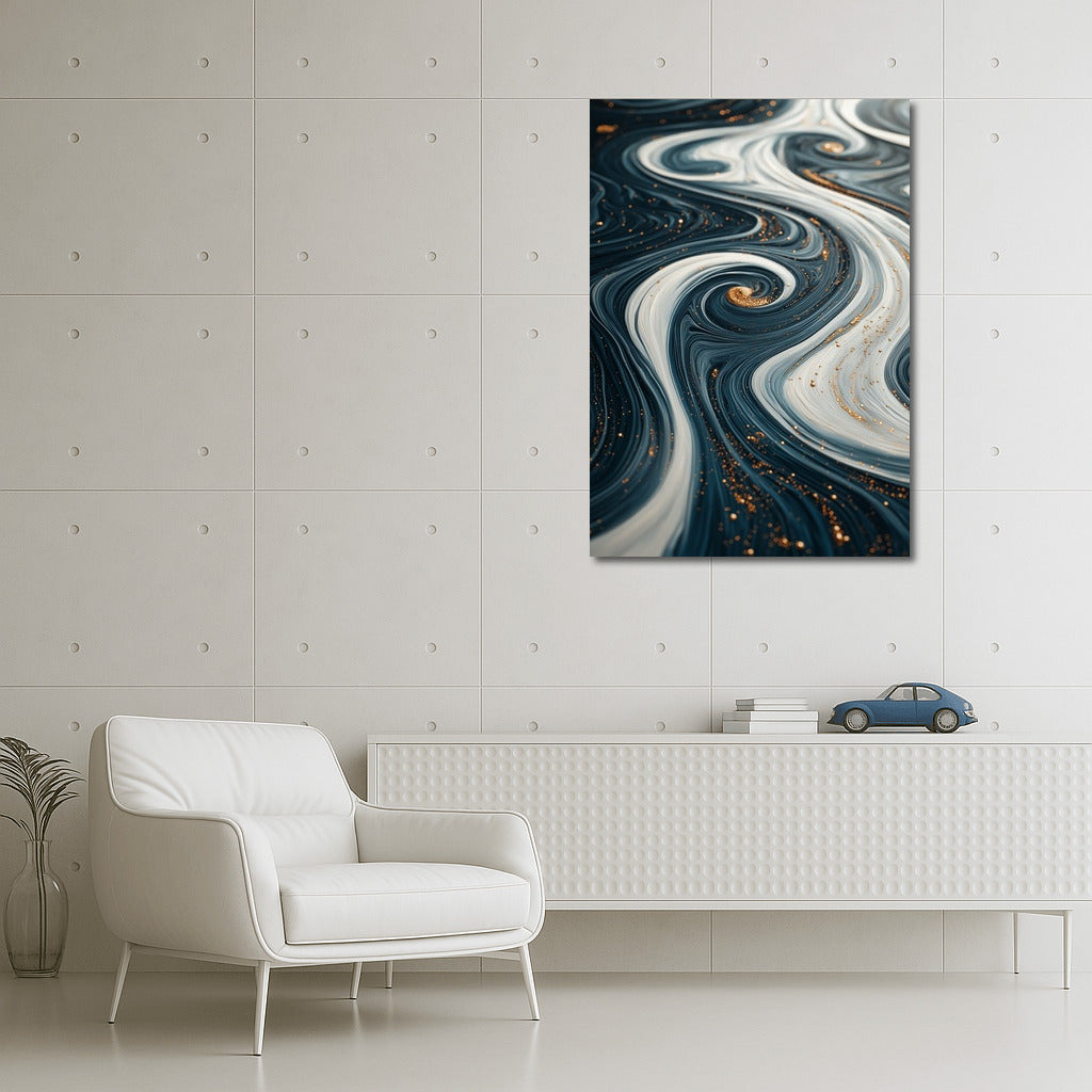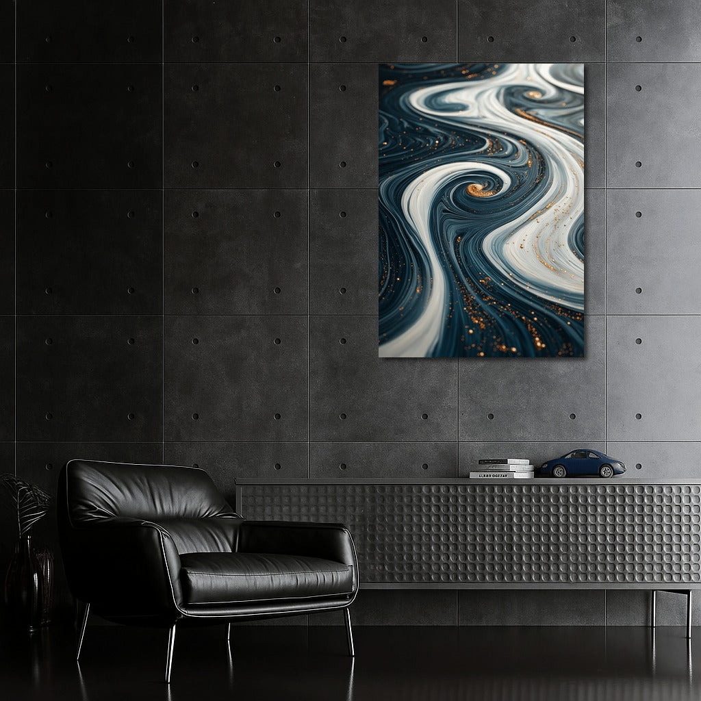Abstract wave of fantasy: the poster captivates with the dance of white and gold lines on a dark background. Wall art for dreamers. See more from the collection: Mixed Wall Art