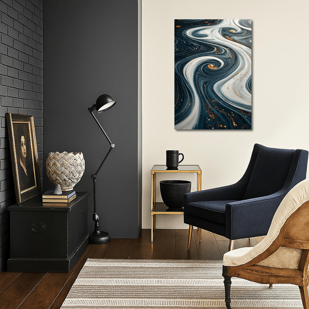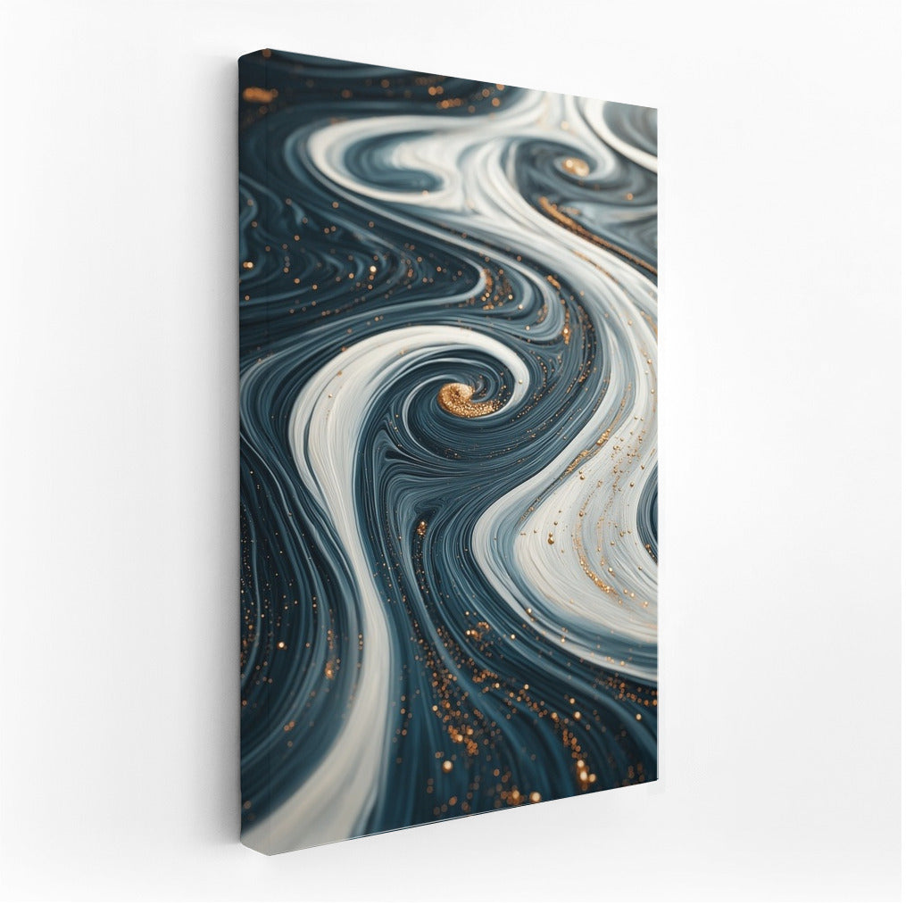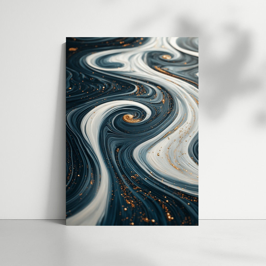 Abstract wave of fantasy: the poster captivates with the dance of white and gold lines on a dark background. Wall art for dreamers. See more from the collection: Mixed Wall Art