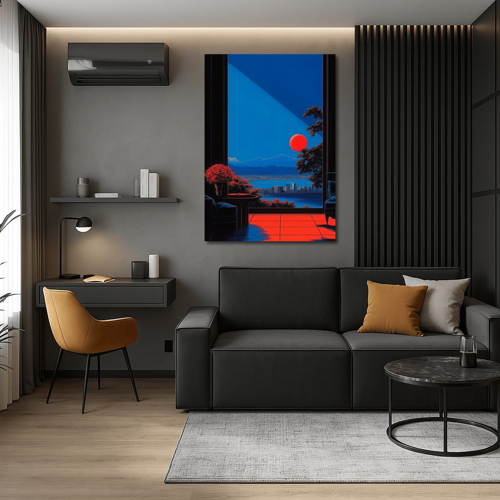 Sunset Charm: A poster of a city view and a scarlet sunset that fills the room with magic and dreams. Wall art for the soul. See more from the collection: Futurism Art