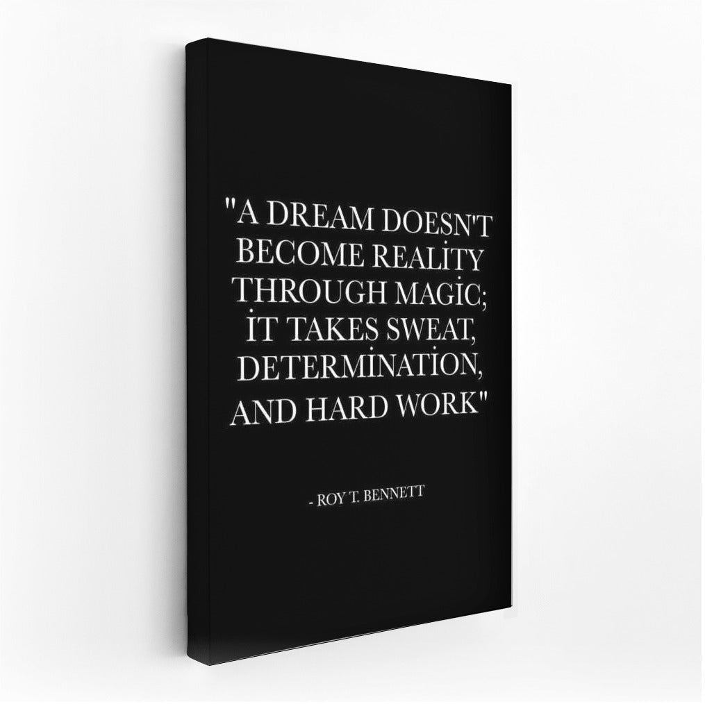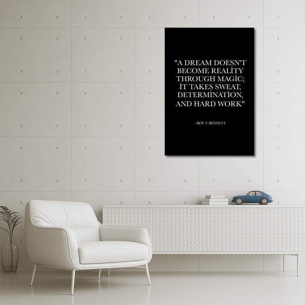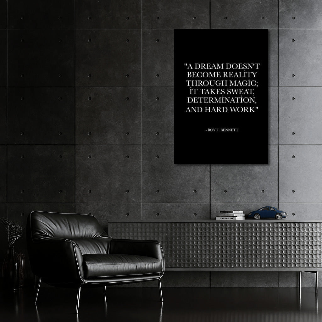 A poster with a quote by Roy T. Bennett: A dream doesn’t become reality through magic; it takes sweat, determination, and hard work. Wall art that gives inspiration and motivation every day. See more from the collection: Inspirational & Motivational Quotes Art
