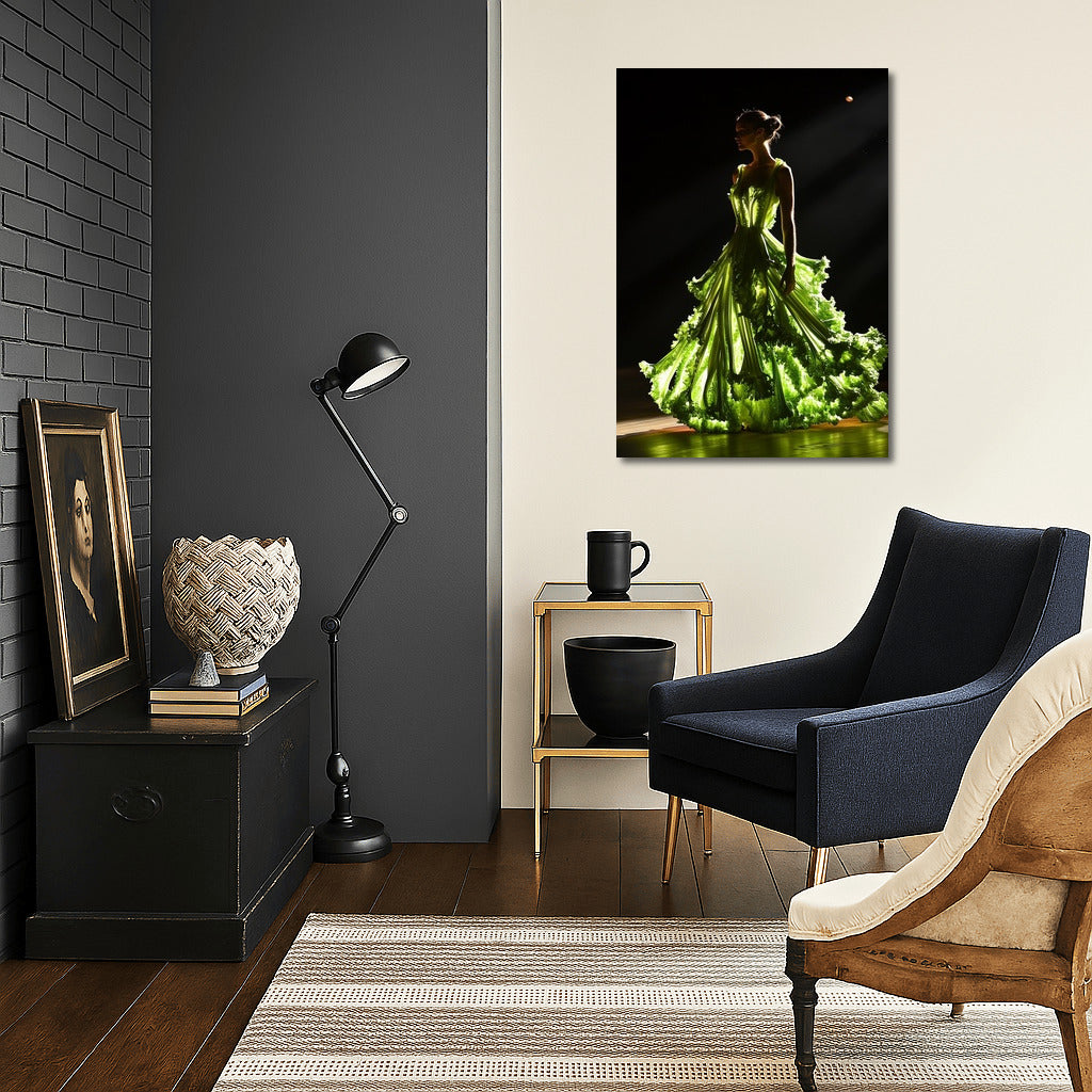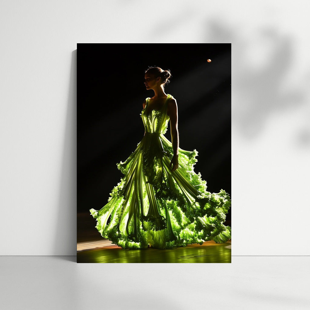Poster Glow in the Green: a mysterious silhouette in a luxurious dress made of salad leaves. Wall art that inspires you to dream! See more from the collection: Fashion Art