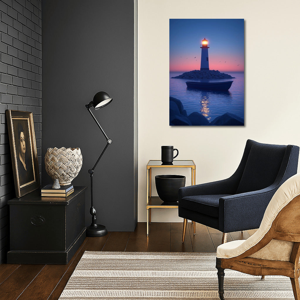 Lighthouse at Sunset is a poster with a tranquil and dreamy atmosphere. Create a cozy atmosphere with this painting that transforms wall art. See more from the collection: Mixed Wall Art