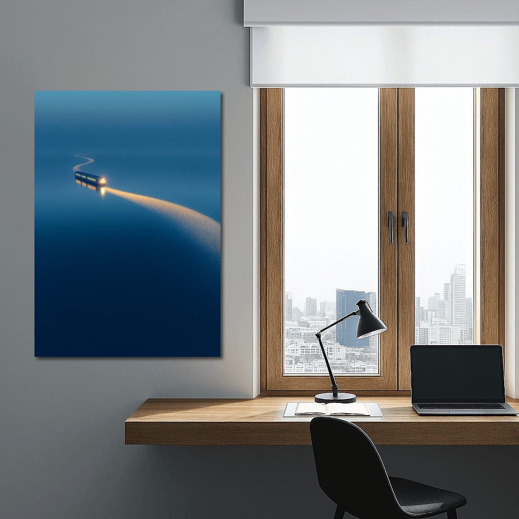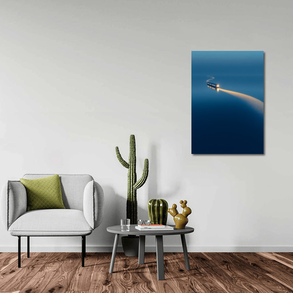 A mysterious train rushes through the blue twilight, illuminating the path with the light of a dream. Add atmosphere to the interior with this poster! See more from the collection: Mixed Wall Art