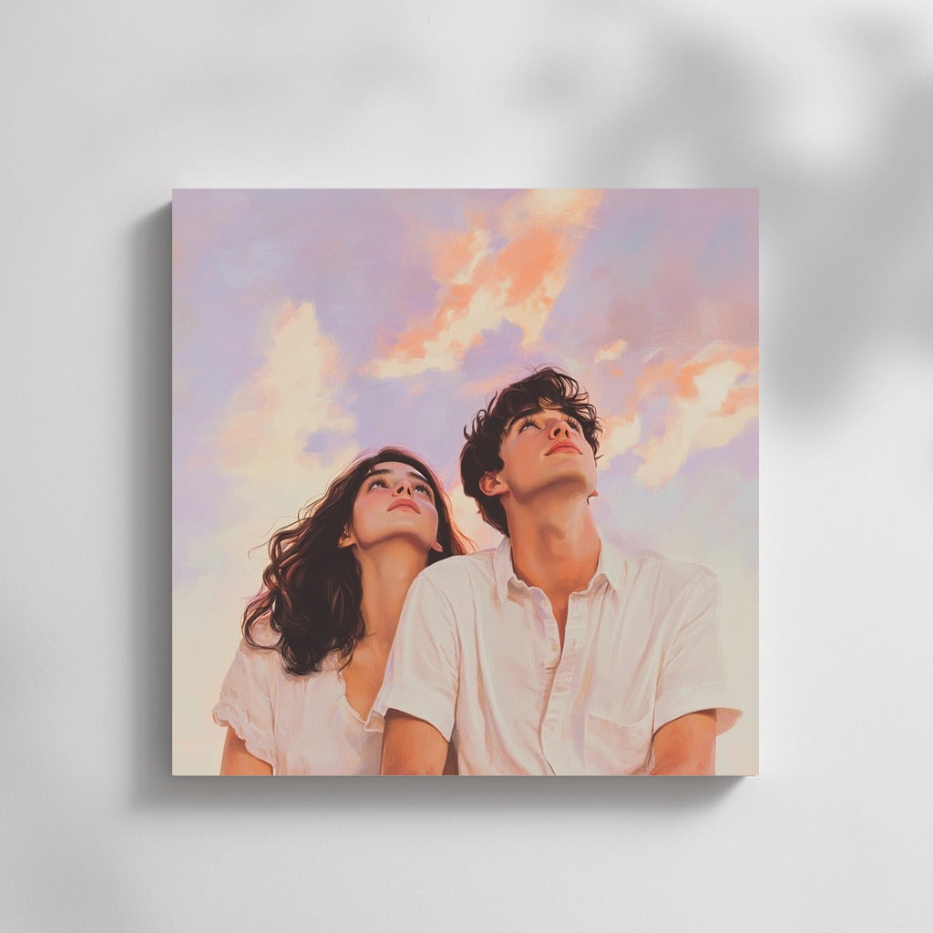 Romantic painting of two people gazing at the clouds, dreaming about the future. Watercolor shades are the perfect wall art for inspiration. See more from the collection: Love Art