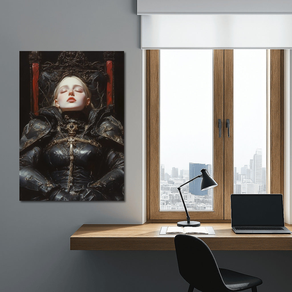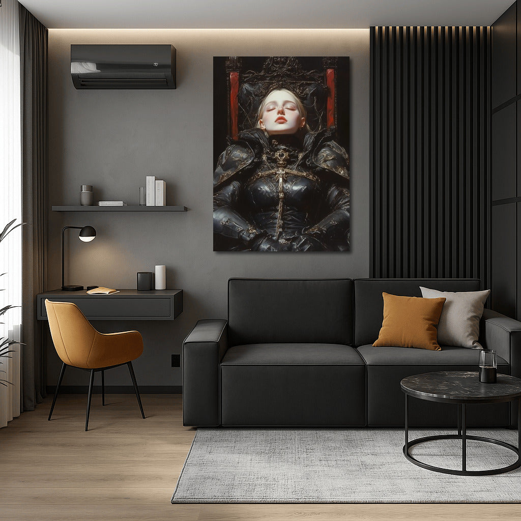 Explore the mysterious atmosphere embodied in the poster, where the character in armor is immersed in sleep or dreams. Gothic style wall art. See more from the collection: Mixed Wall Art