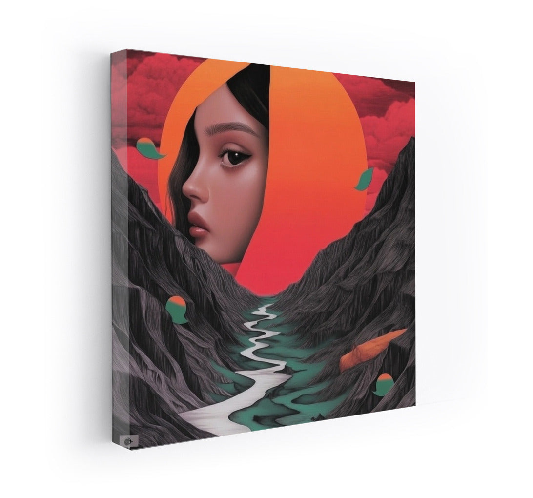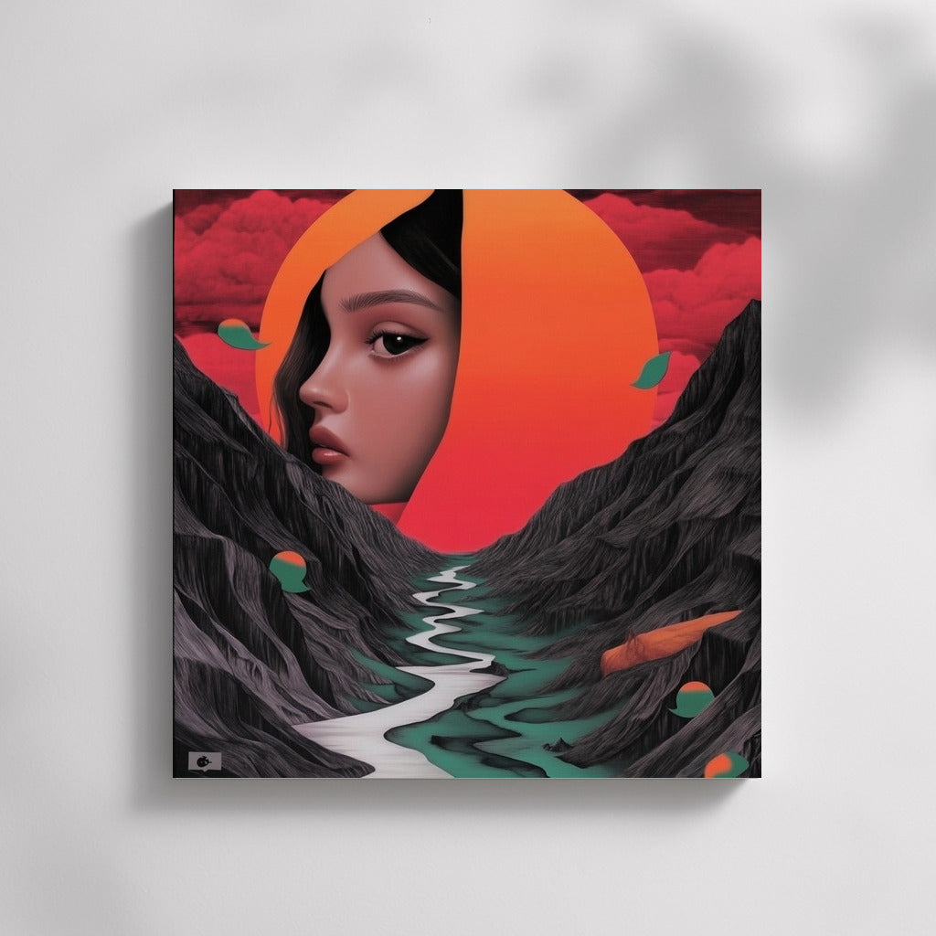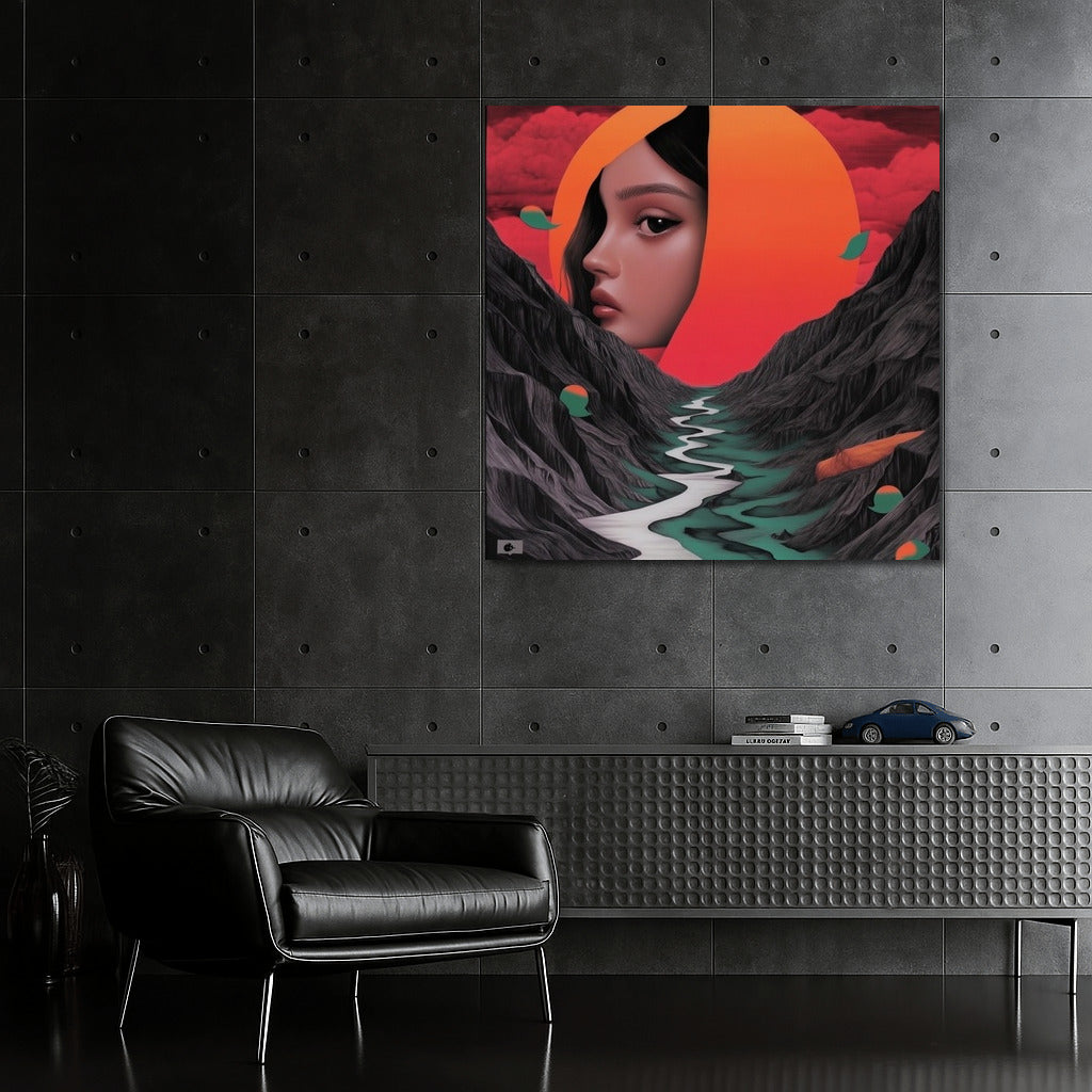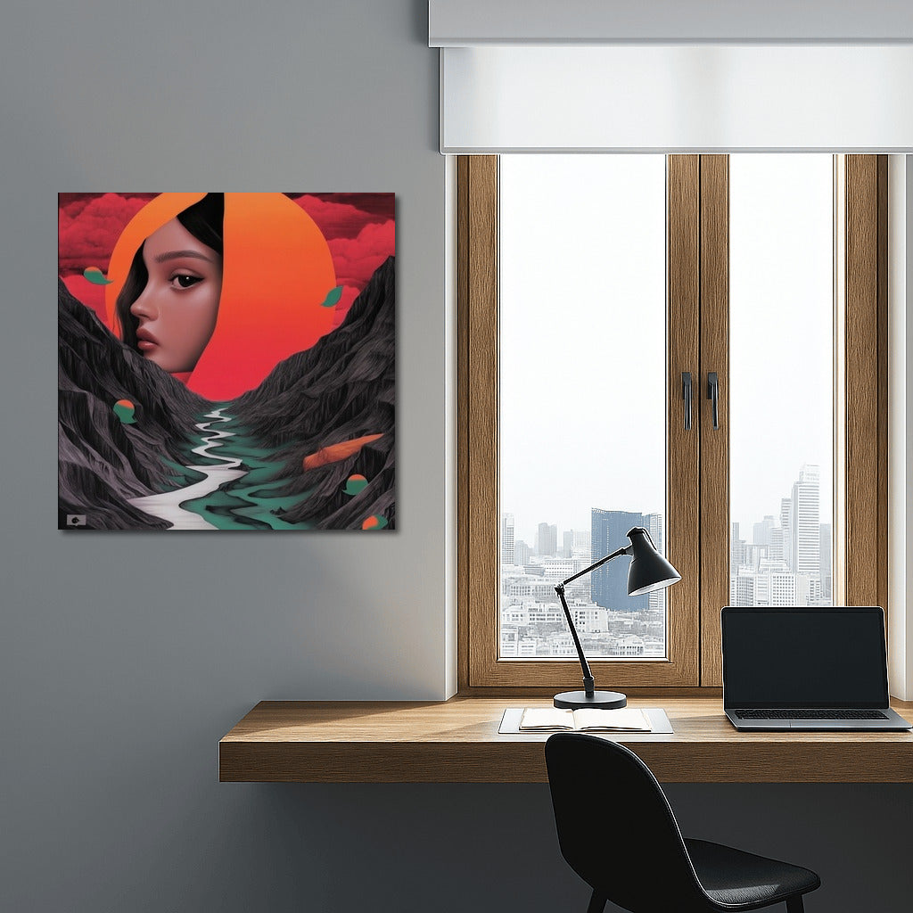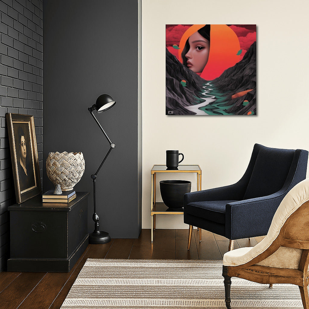 Abstract painting: mysterious look from beyond the horizon, river flows through dreams. Modern wall art for inspiration. See more from the collection: Mixed Wall Art