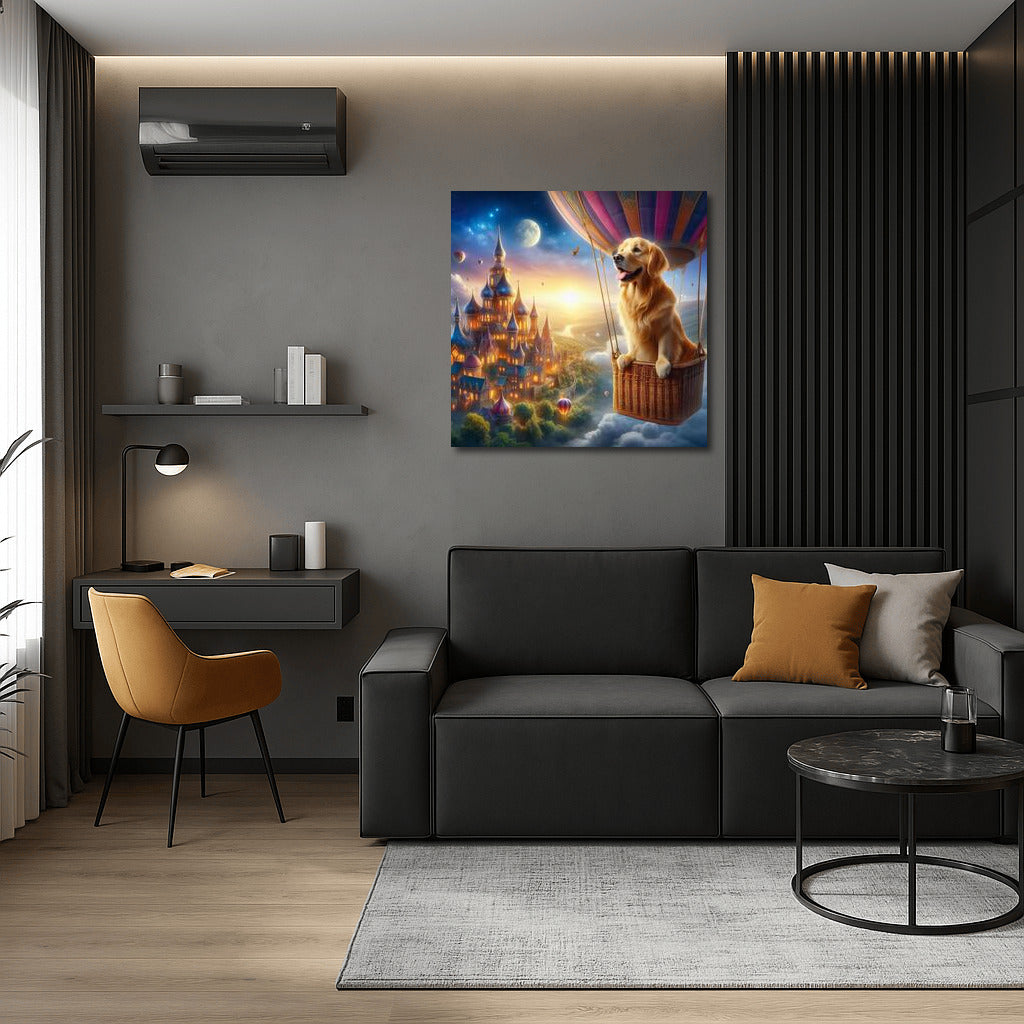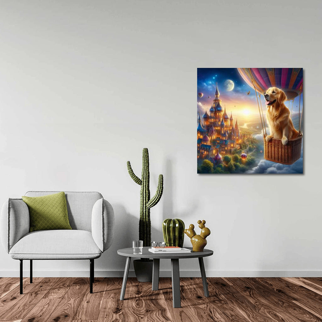 Dreamy Golden Retriever in a Hot Air Balloon over Fairytale Town Wall Art