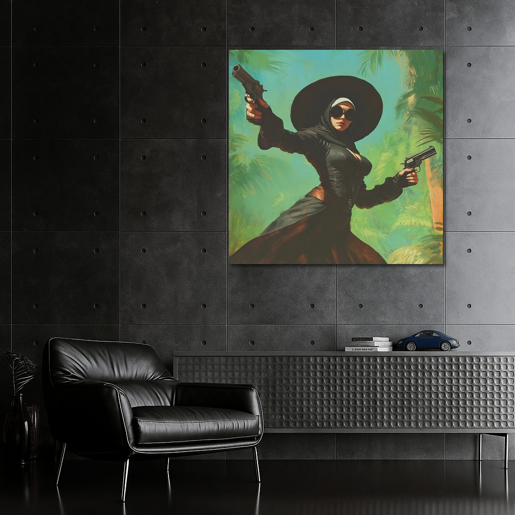 Bold poster: a mysterious figure in a hat and glasses, holding two revolvers. Add intrigue to your wall art! See more from the collection: Mixed Wall Art