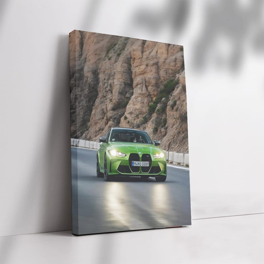 This painting is pure adrenaline on the wall. Juicy Green BMW M3 G80 in motion is like hitting the gas and feeling the roar of the engine. A poster for those who live in speed. Wall art that charges with energy. See more from the collection: BMW 3 Series Art