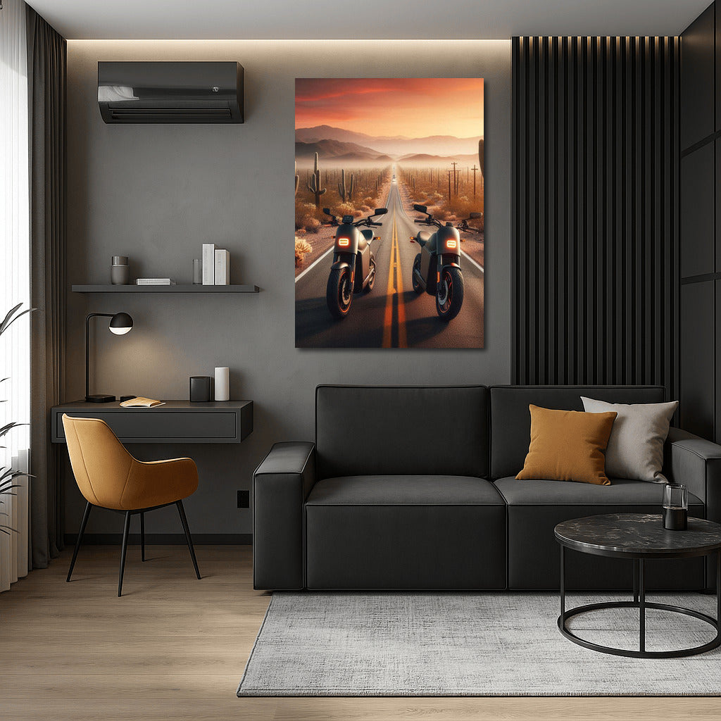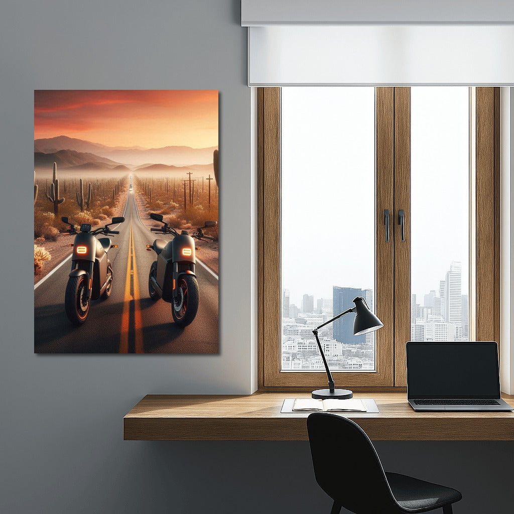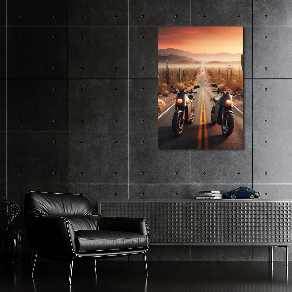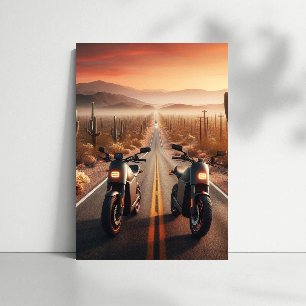 Electric bikes on the road through the desert, as a symbol of endless horizons. Dive into the world of freedom with this poster! See more from the collection: Electric Motorcycle Art