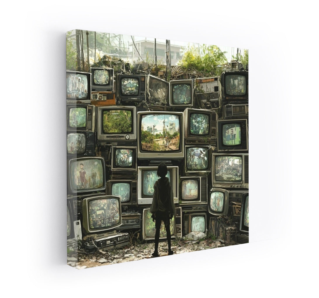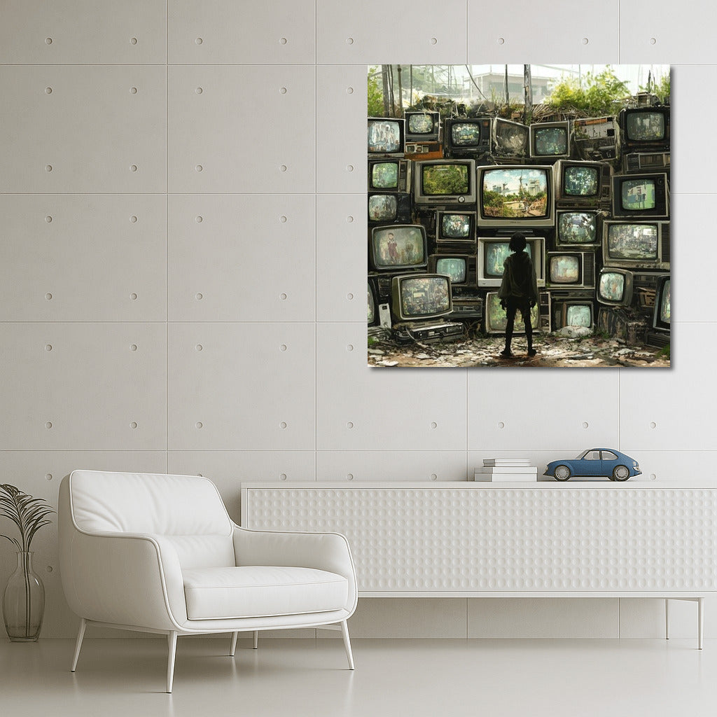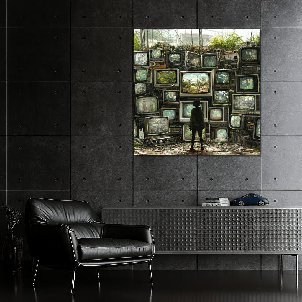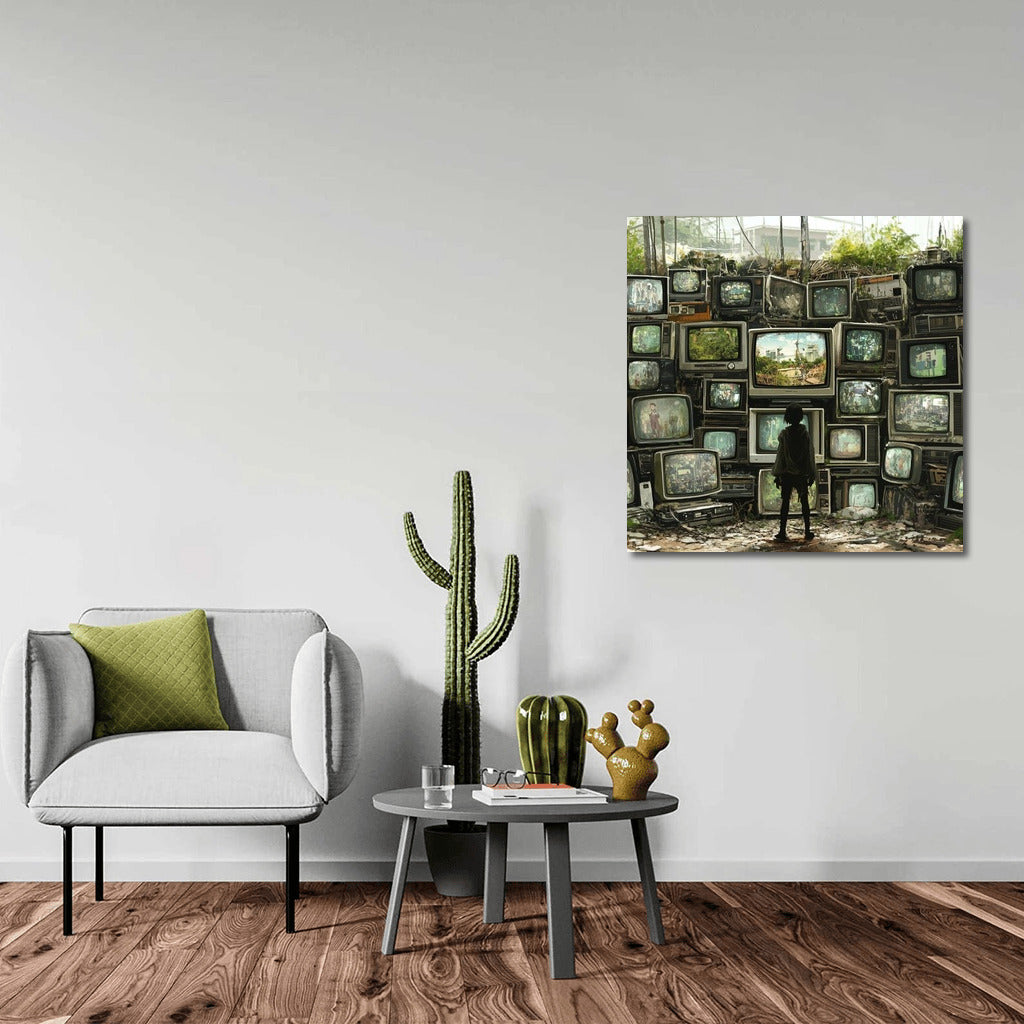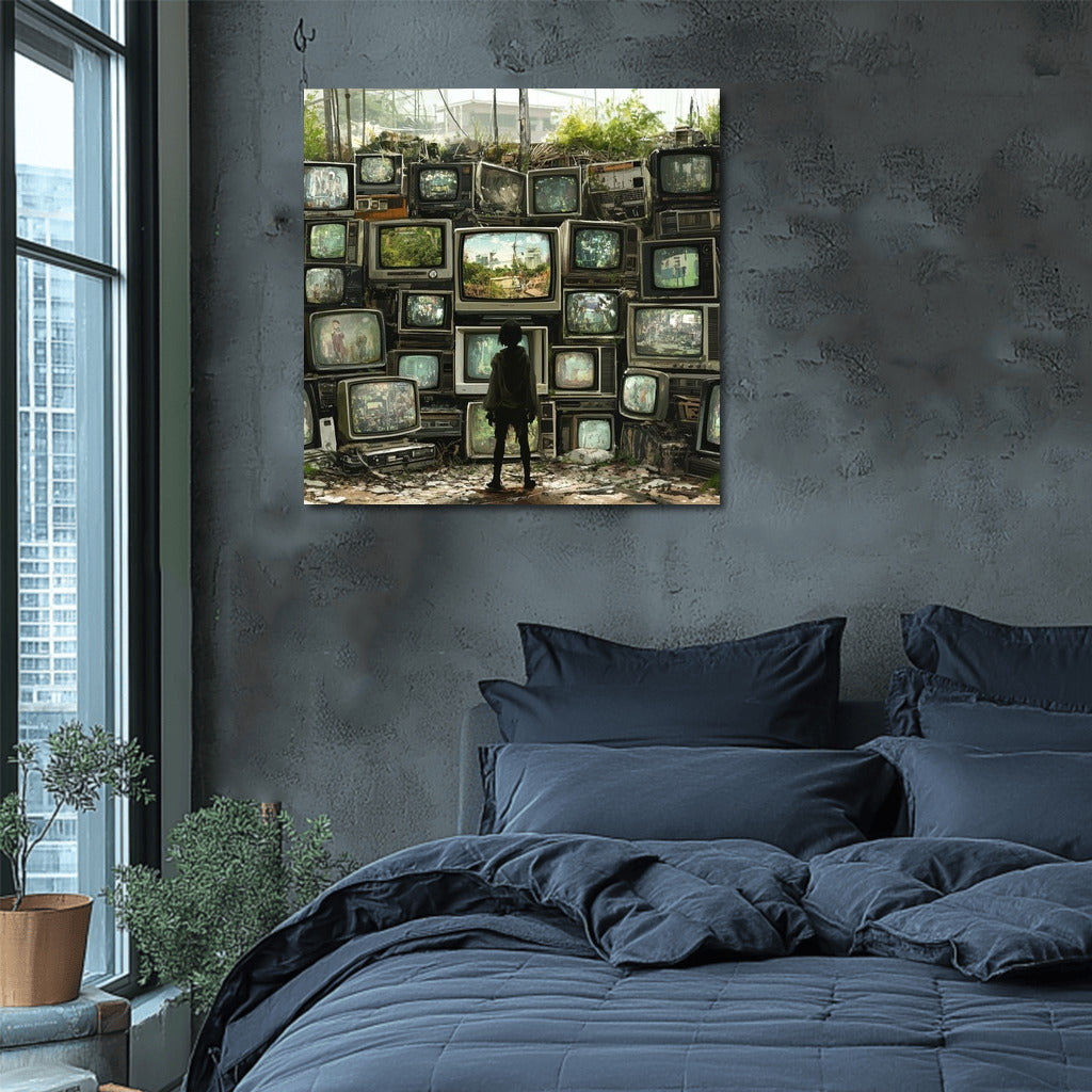 A captivating poster featuring a figure in front of a wall of vintage televisions, creating an atmosphere of retro-futurism and deep thought. See more from the collection: Mixed Wall Art