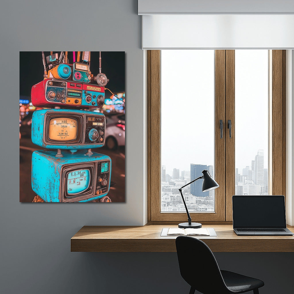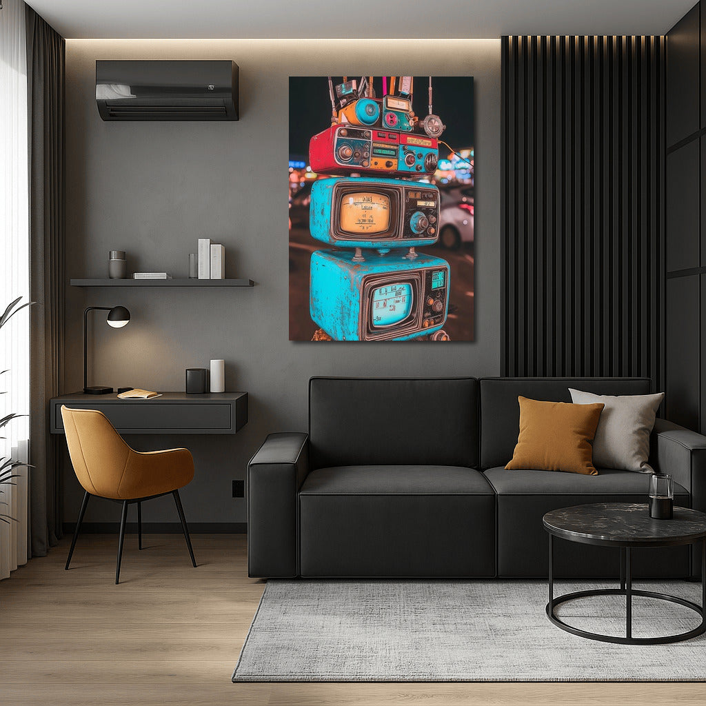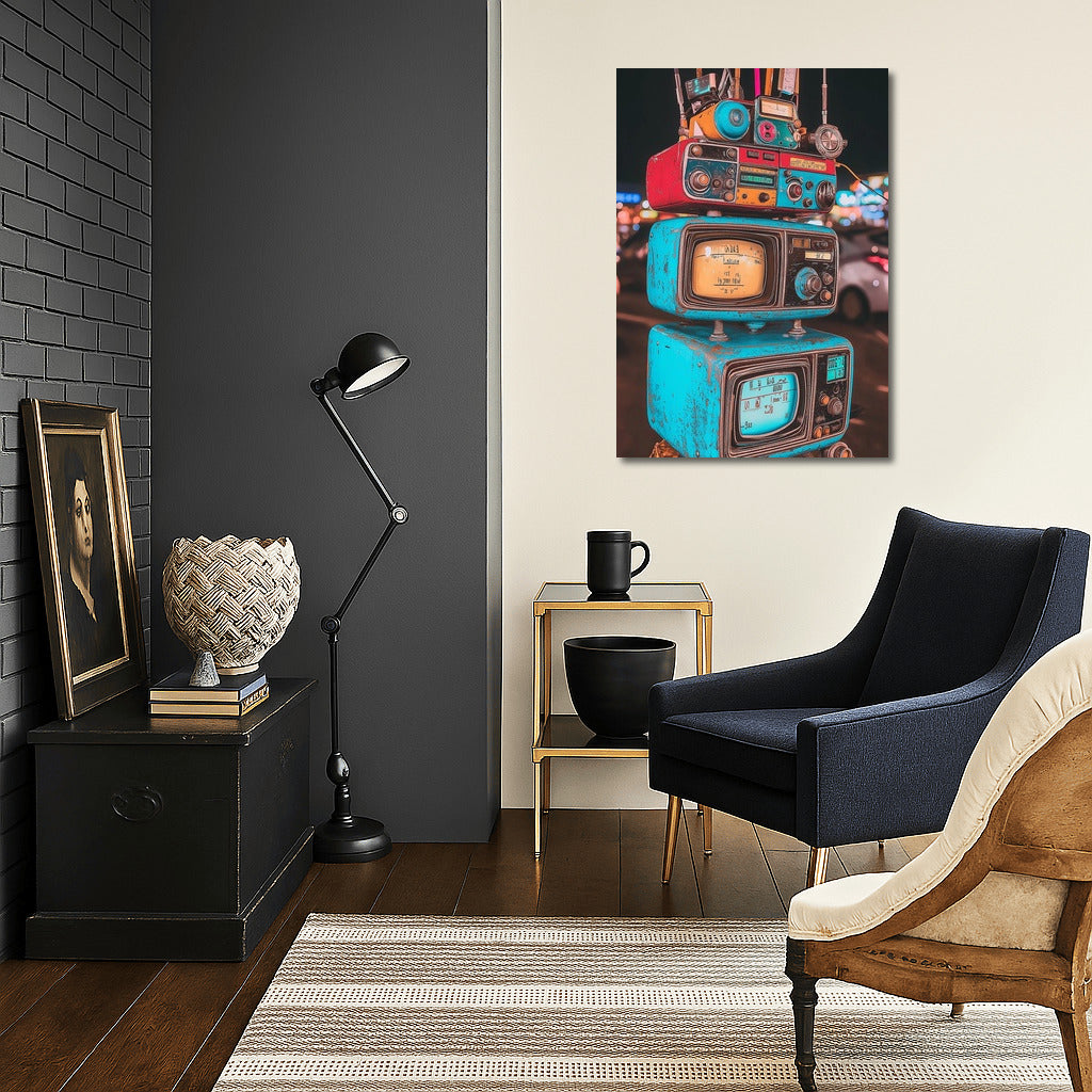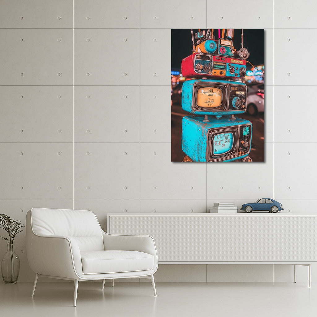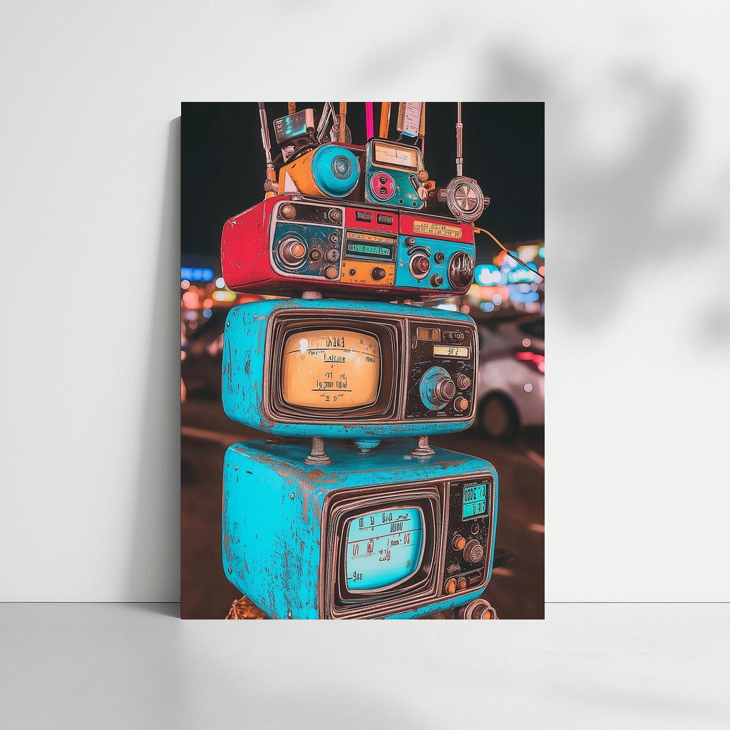 A vibrant poster of retro radios and televisions is a stylish wall art that brings back memories of the past. See more from the collection: Pop Art