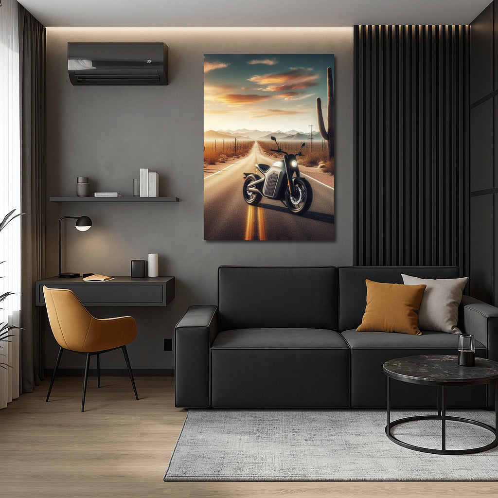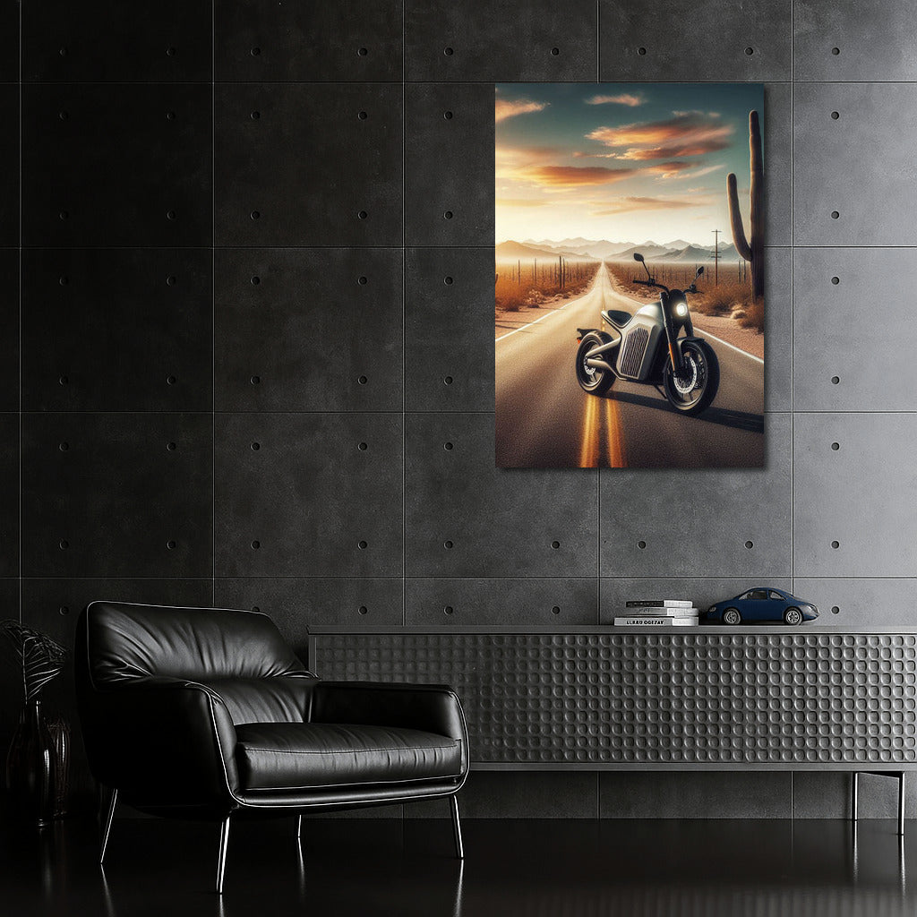An electric bike speeds along a desert road, through cacti and endless horizons. Contemporary wall art for dreamers. See more from the collection: Electric Motorcycle Art