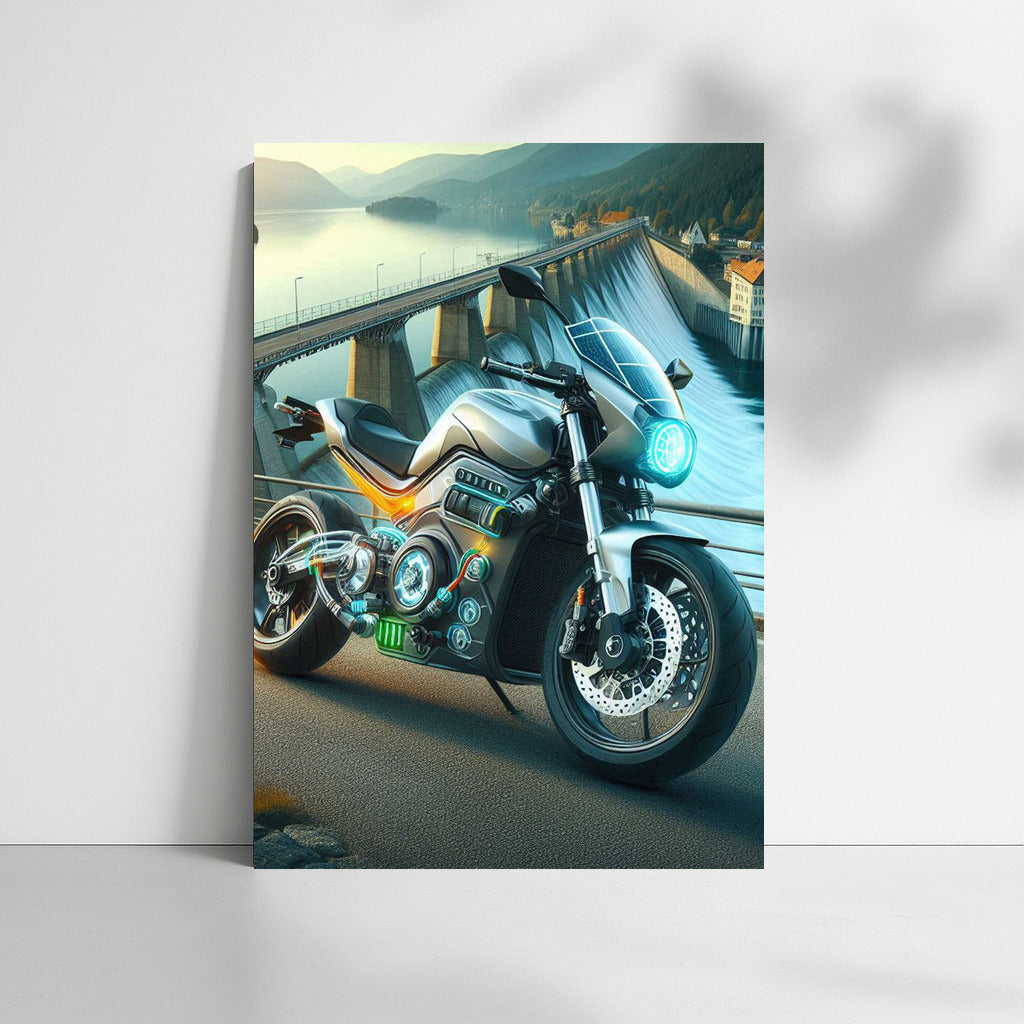 Electric Motorcycle Conquers Dam: Dynamic Wall Art Combines Innovation and Nature in One Poster See more from the collection: Electric Motorcycle Art