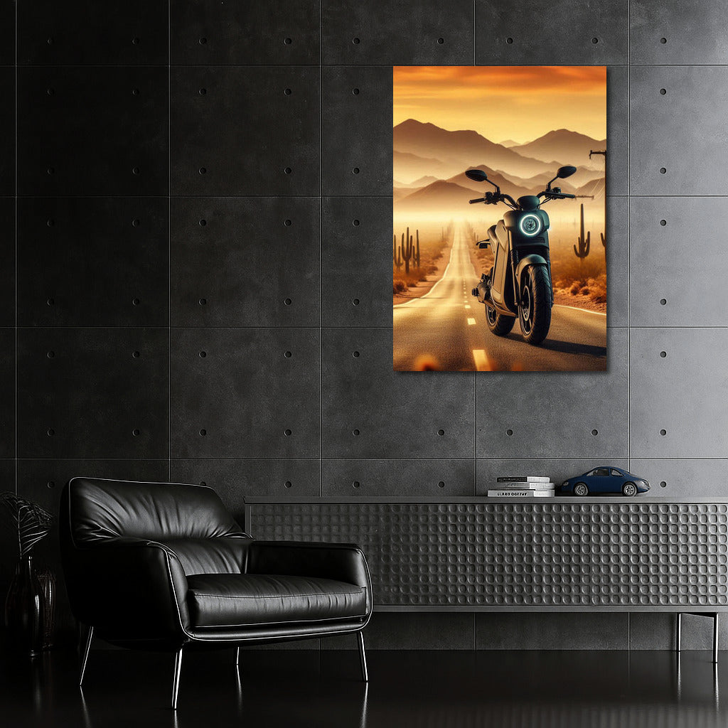 Electric motorcycle on desert road: inspirational poster with horizon and cacti. Perfect wall art for dreamers. See more from the collection: Electric Motorcycle Art