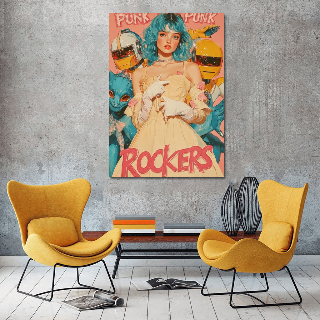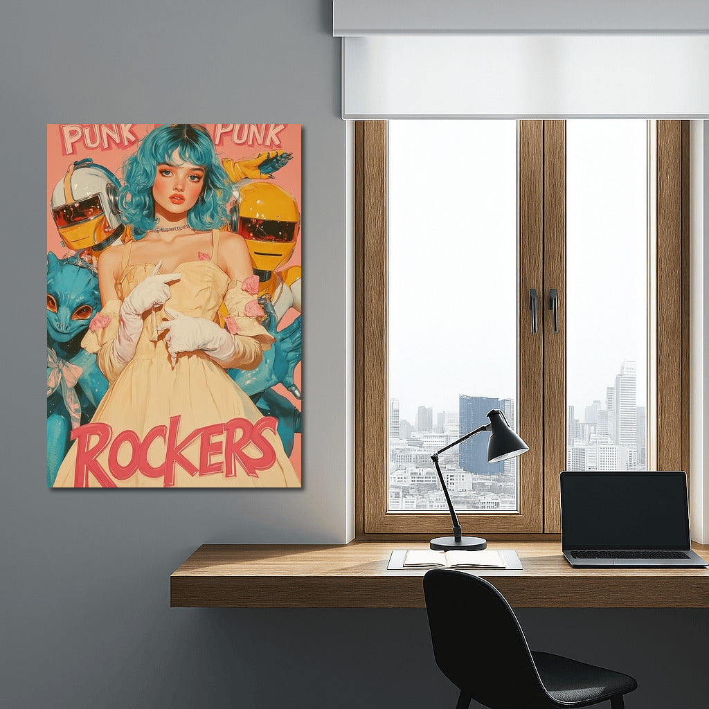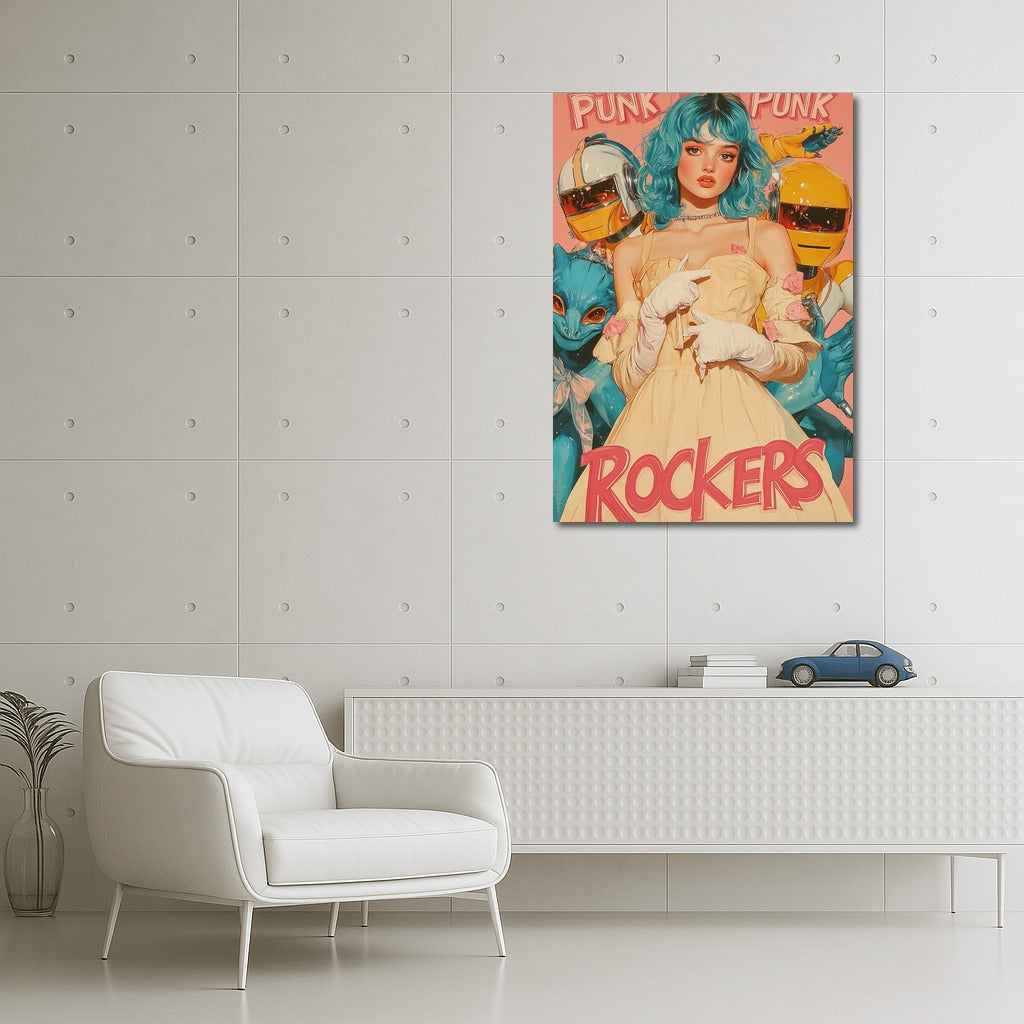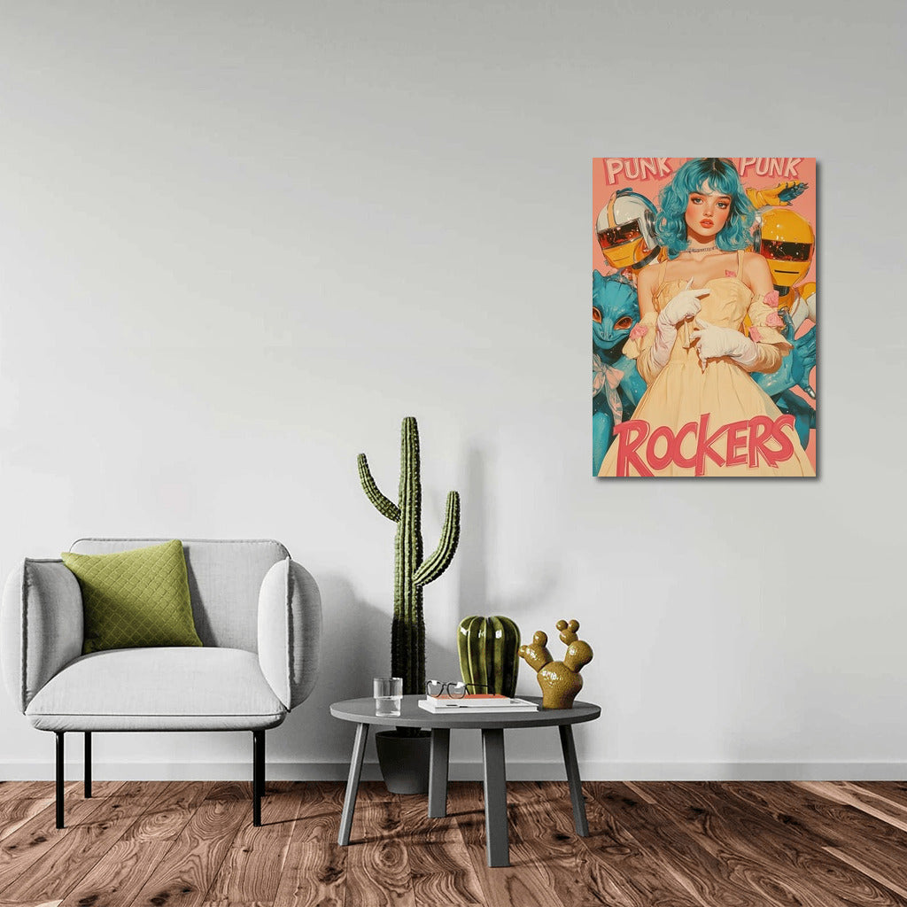 A bright punk poster featuring a girl with bright hair and fantastic companions. Add energy to your wall art! See more from the collection: Pop Art