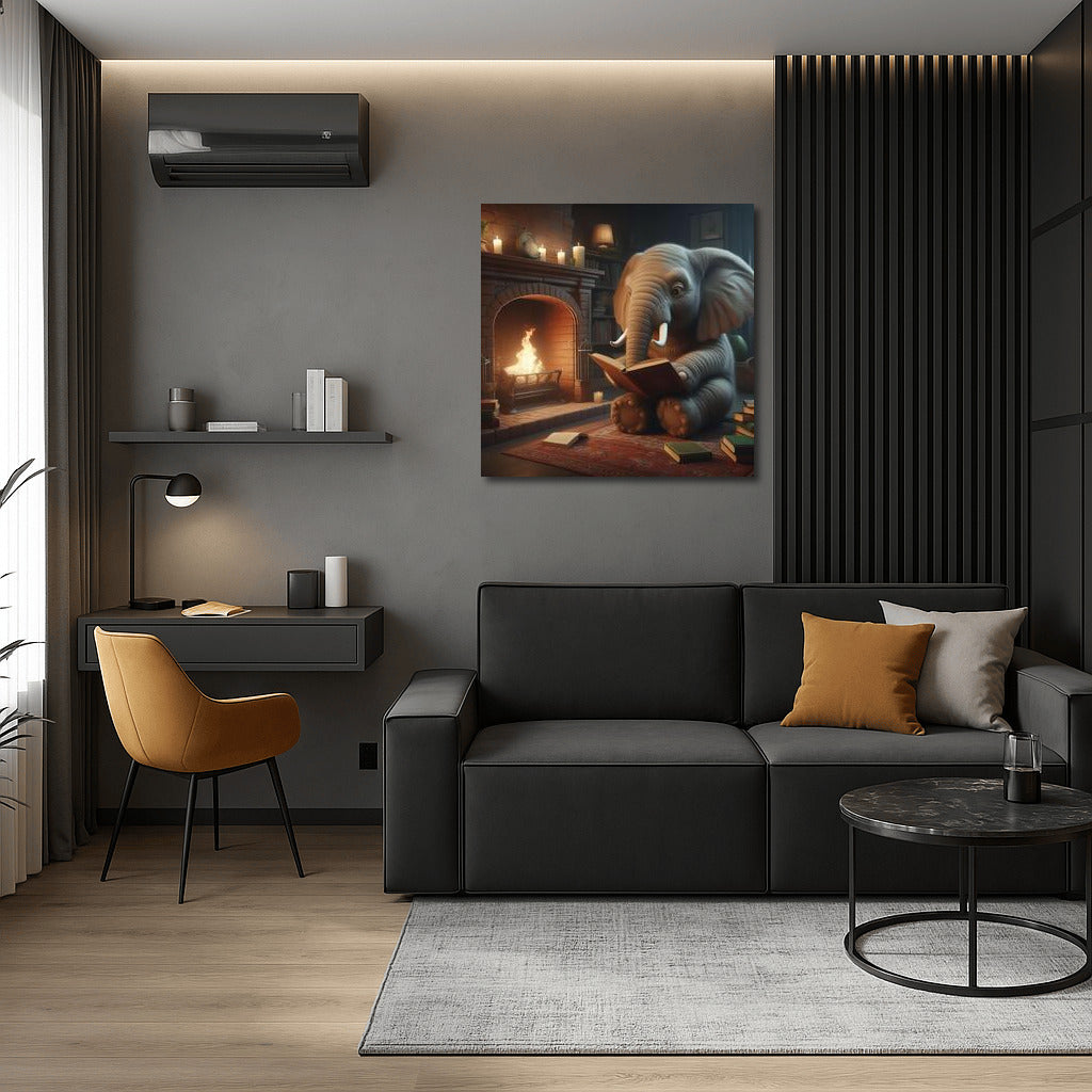 Elephant by the Fireplace: Evening Reading Wall Art