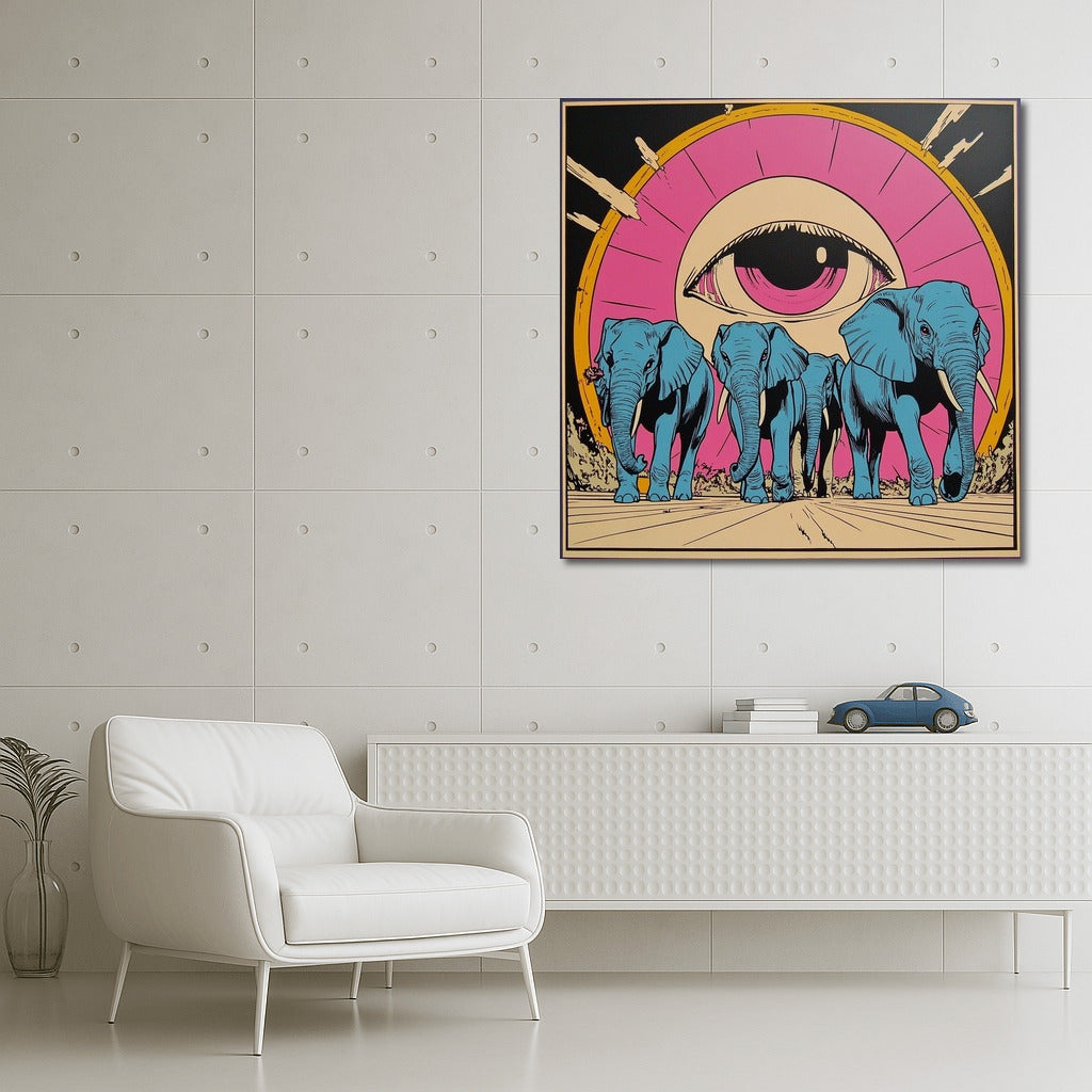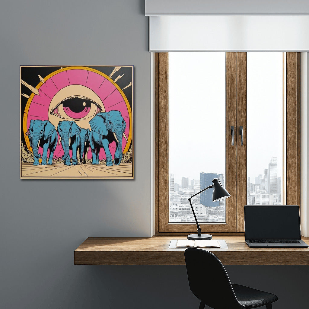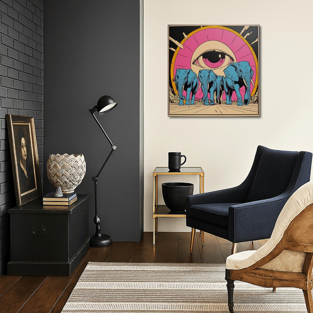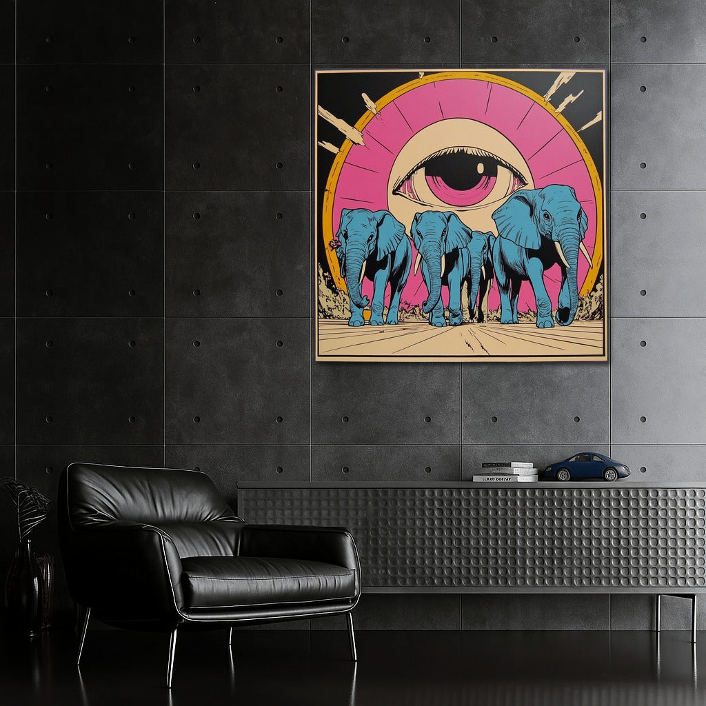Surreal wall art: blue elephants walk under the all-seeing eye. Add mysticism to your interior with this poster! See more from the collection: Mixed Wall Art