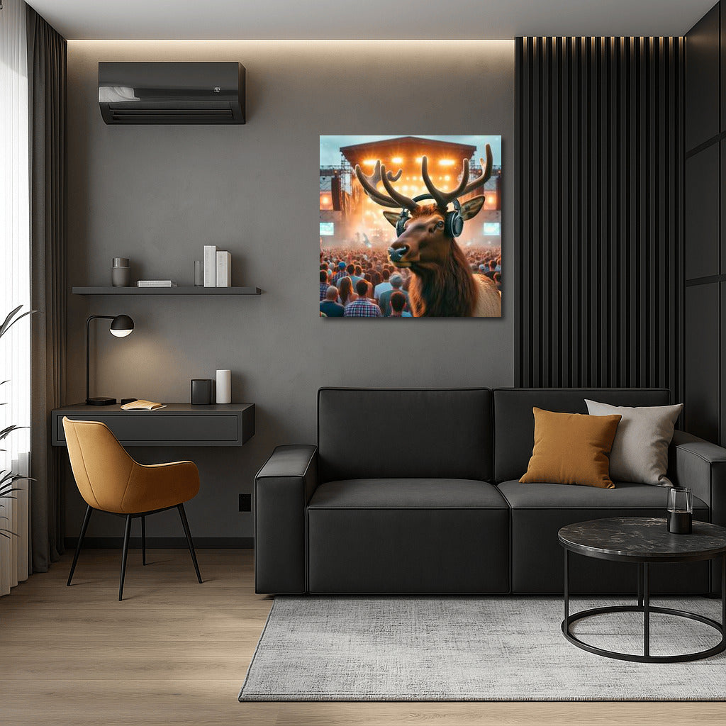 The ironic painting Elk Music Festival 3 brings life to the walls: a deer with headphones against the backdrop of a music festival. Wall art with humor! See more from the collection: Animals Art