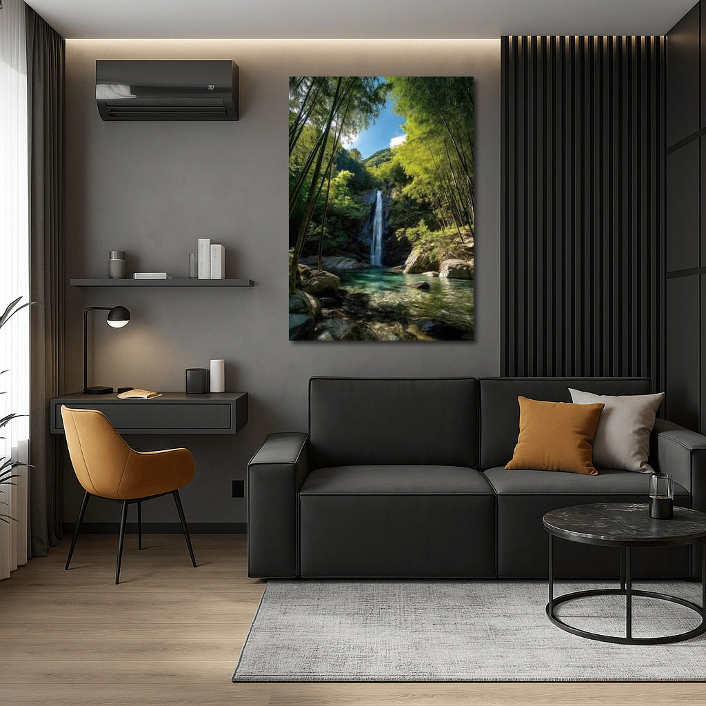 A waterfall hidden in emerald greenery gives freshness and peace. Wall art that embodies the harmony of nature. See more from the collection: Nature & Landscapes Art