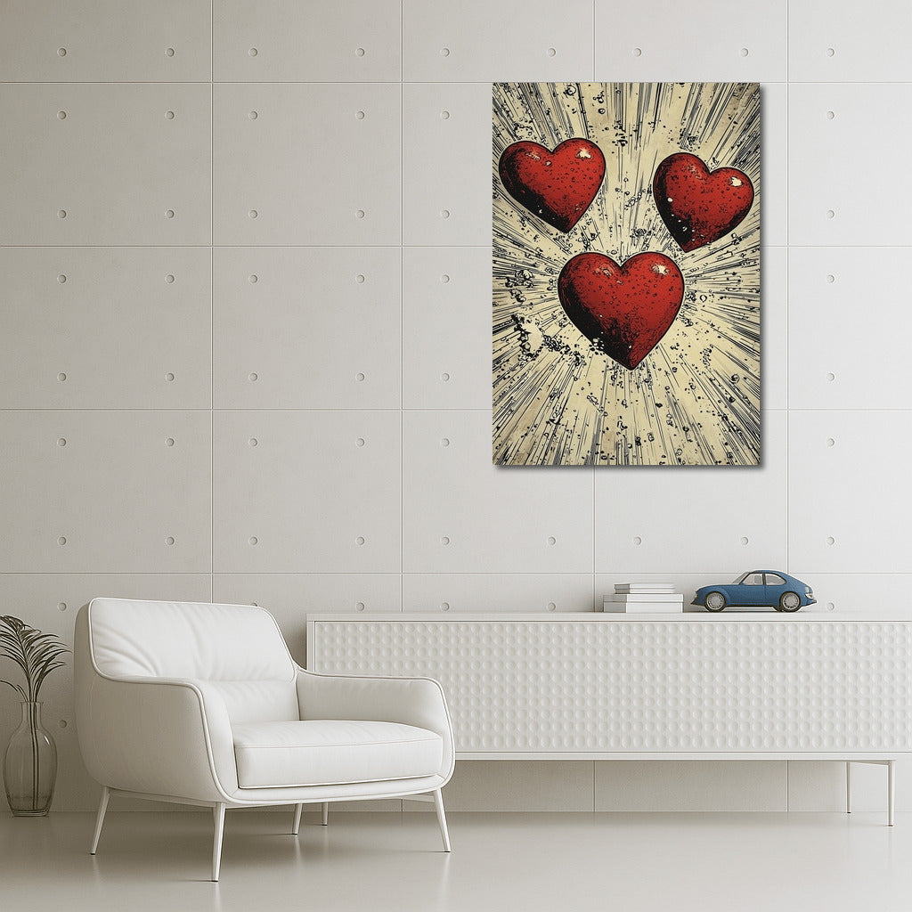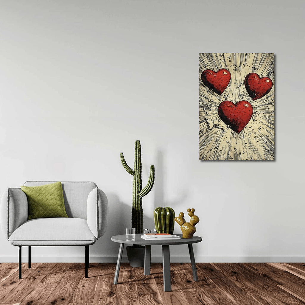 Three bright hearts explode with emotion in this painting. Wall art that will fill your home with energy and love. See more from the collection: Mixed Wall Art