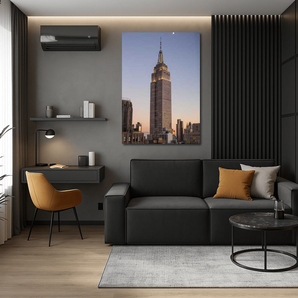Inspiring painting from New York: the grandeur of the Empire State Building under a gentle sunset sky. Wall art USA. See more from the collection: Country Art