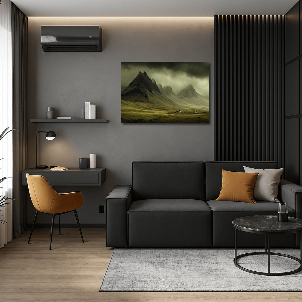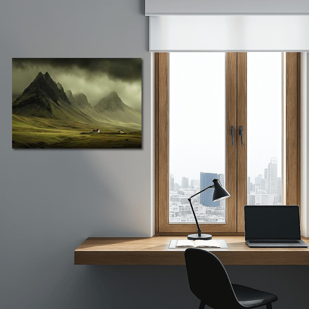 Enchanted Iceland: majestic mountains and cozy houses in the fog in the painting. Beautiful wall art for your comfort. See more from the collection: Country Art