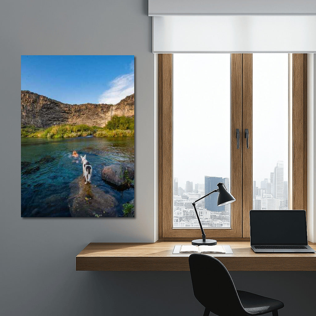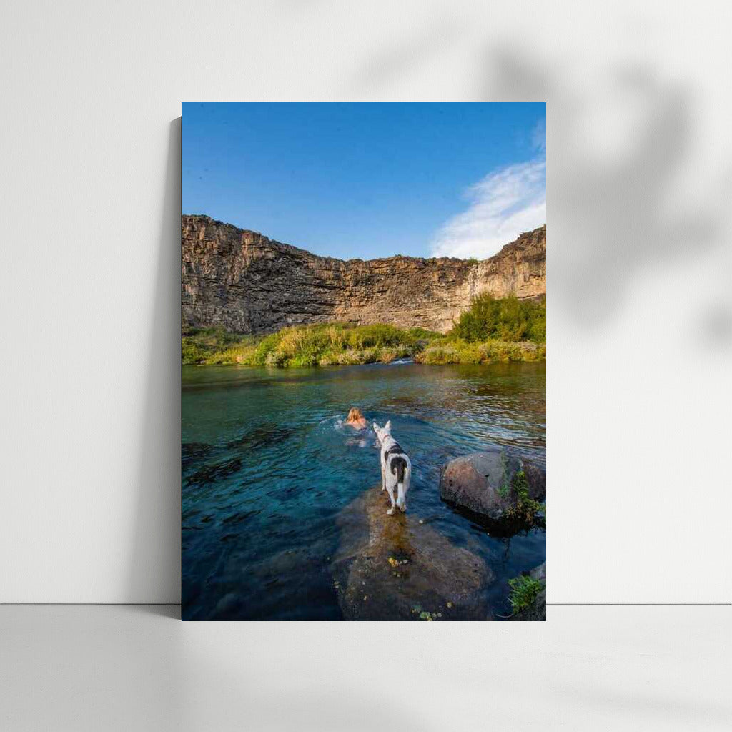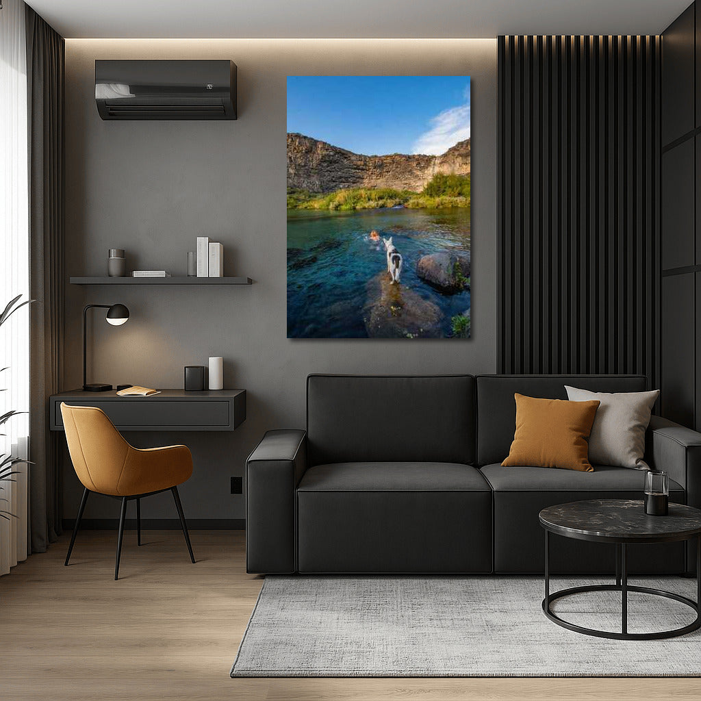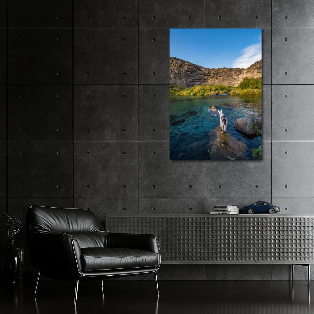 Poster Enchanting nature of Idaho: a leisurely river, the grandeur of the rocks and a faithful friend, filling the space with silence and freshness. See more from the collection: Country Art