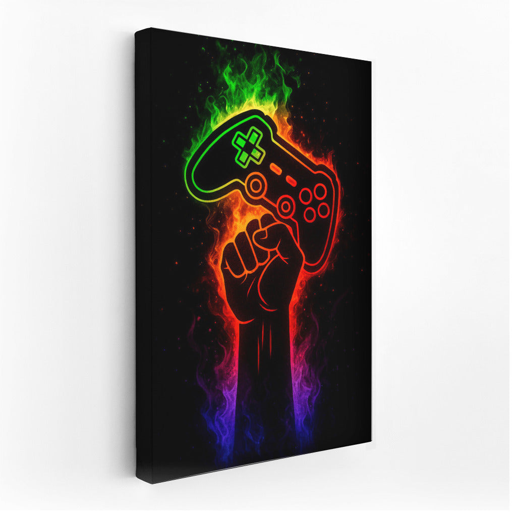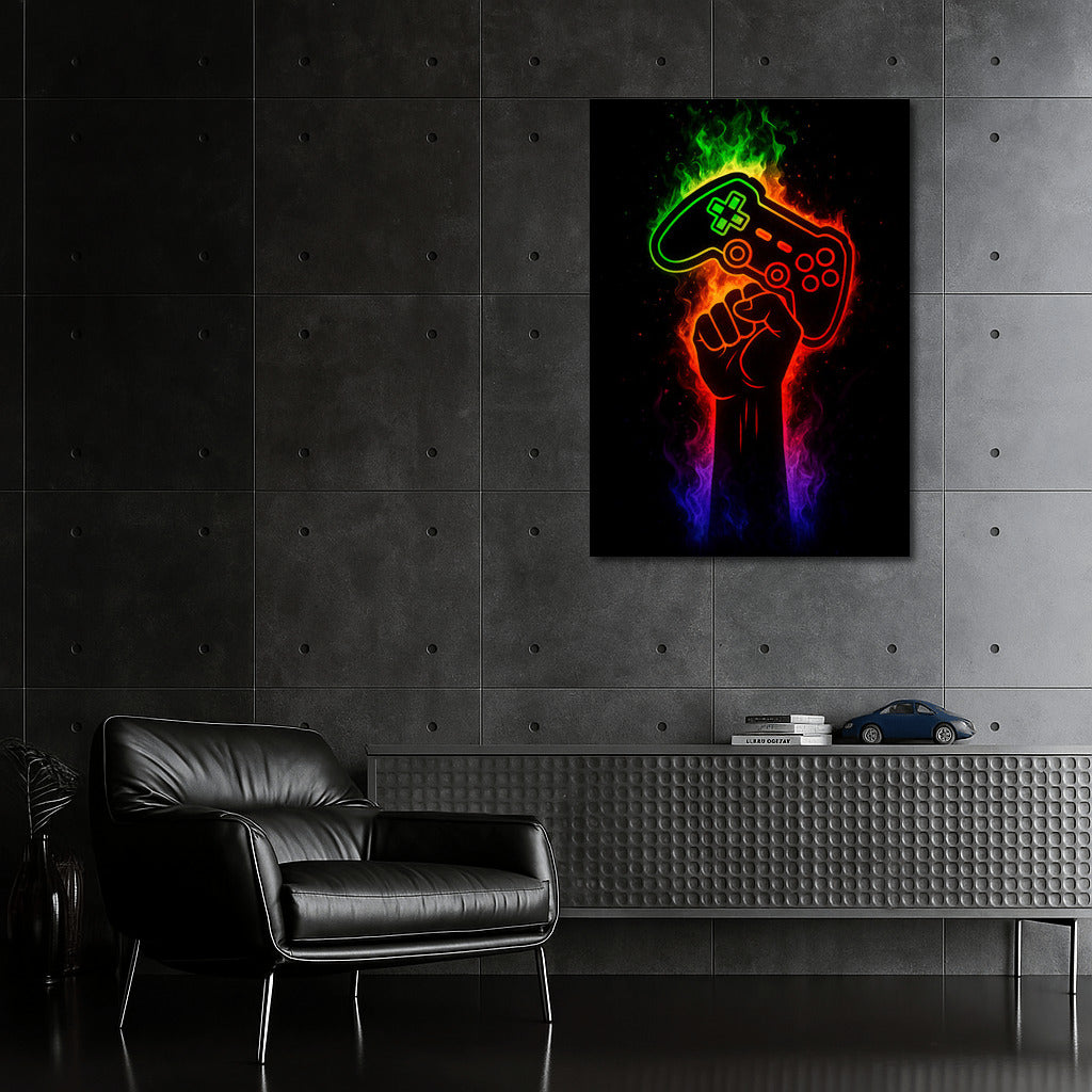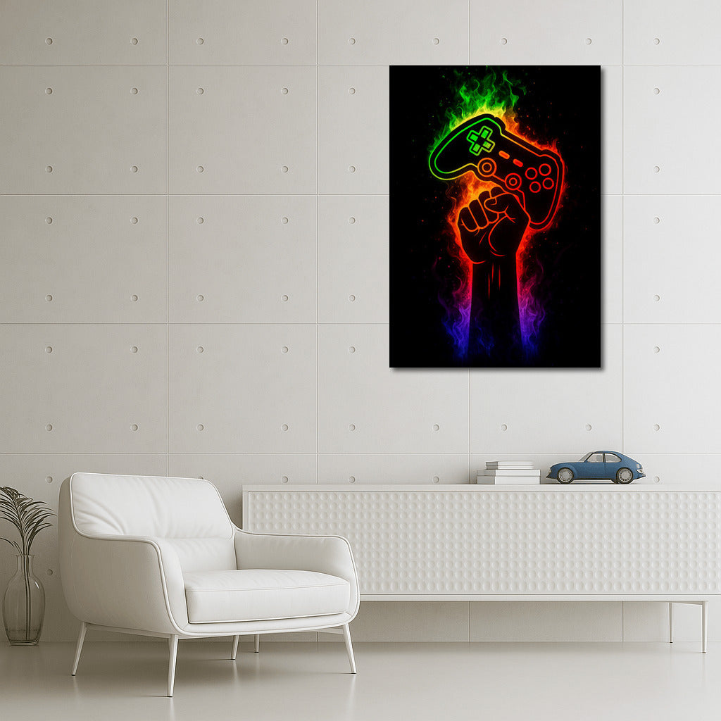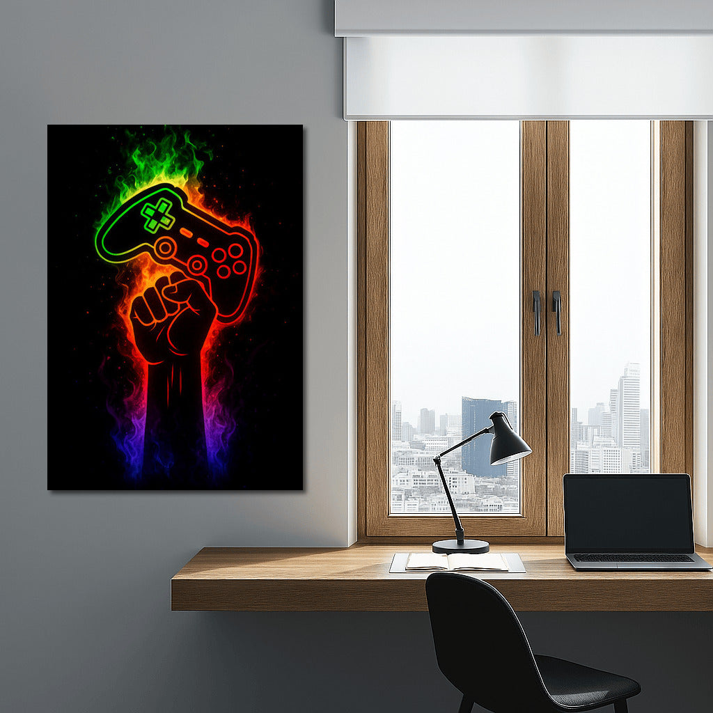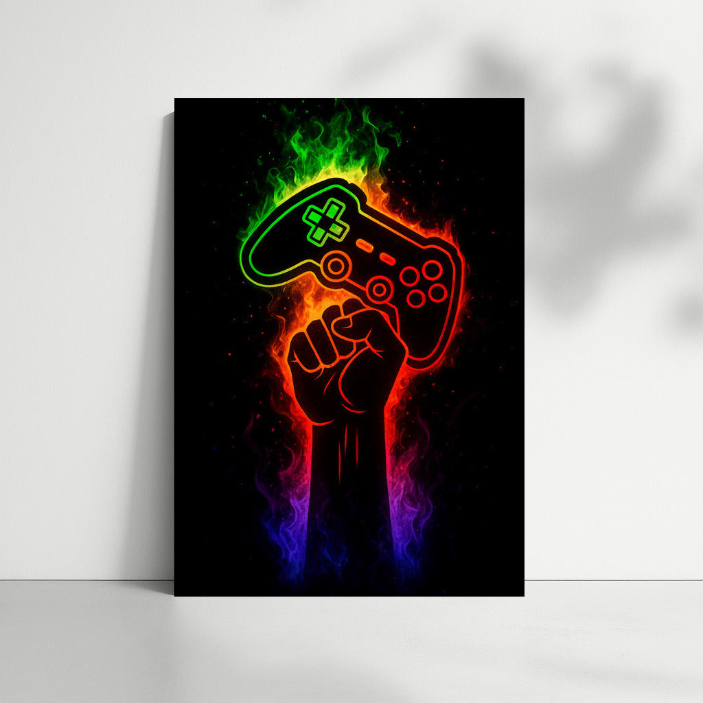 Epic wall art: a bright controller in a raised hand. Gaming energy on your poster! See more from the collection: Gaming Art