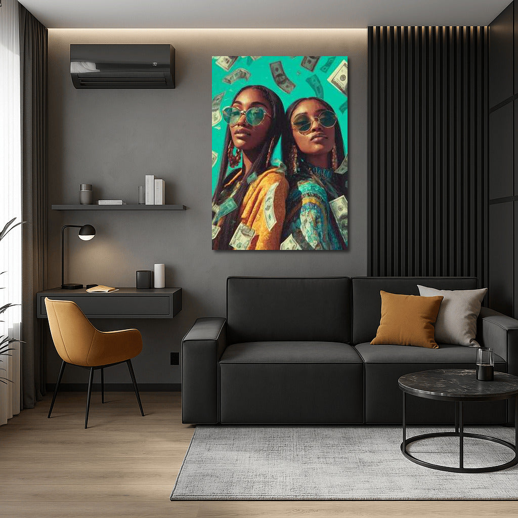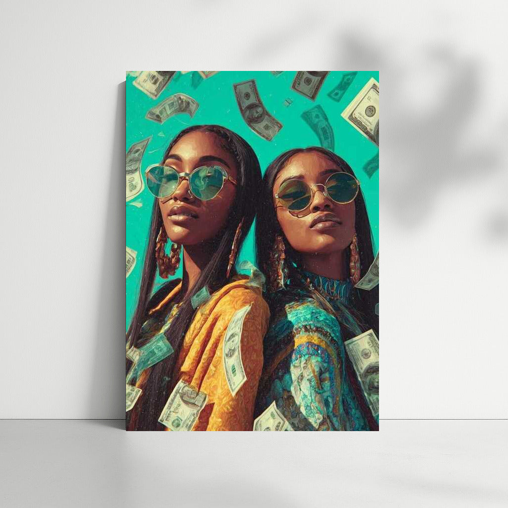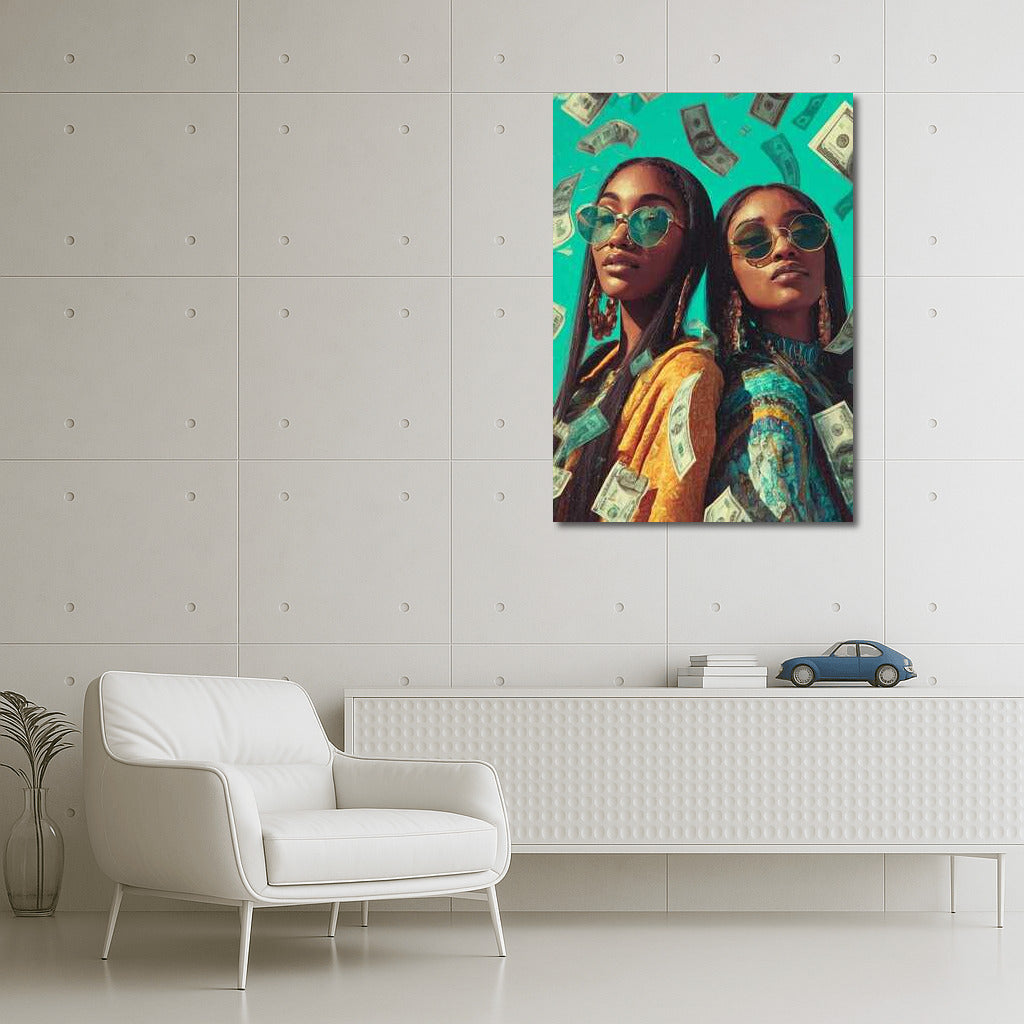Money Vibes poster: two stylish figures in glasses surrounded by flying bills create an atmosphere of luxury and confidence. See more from the collection: Money Art