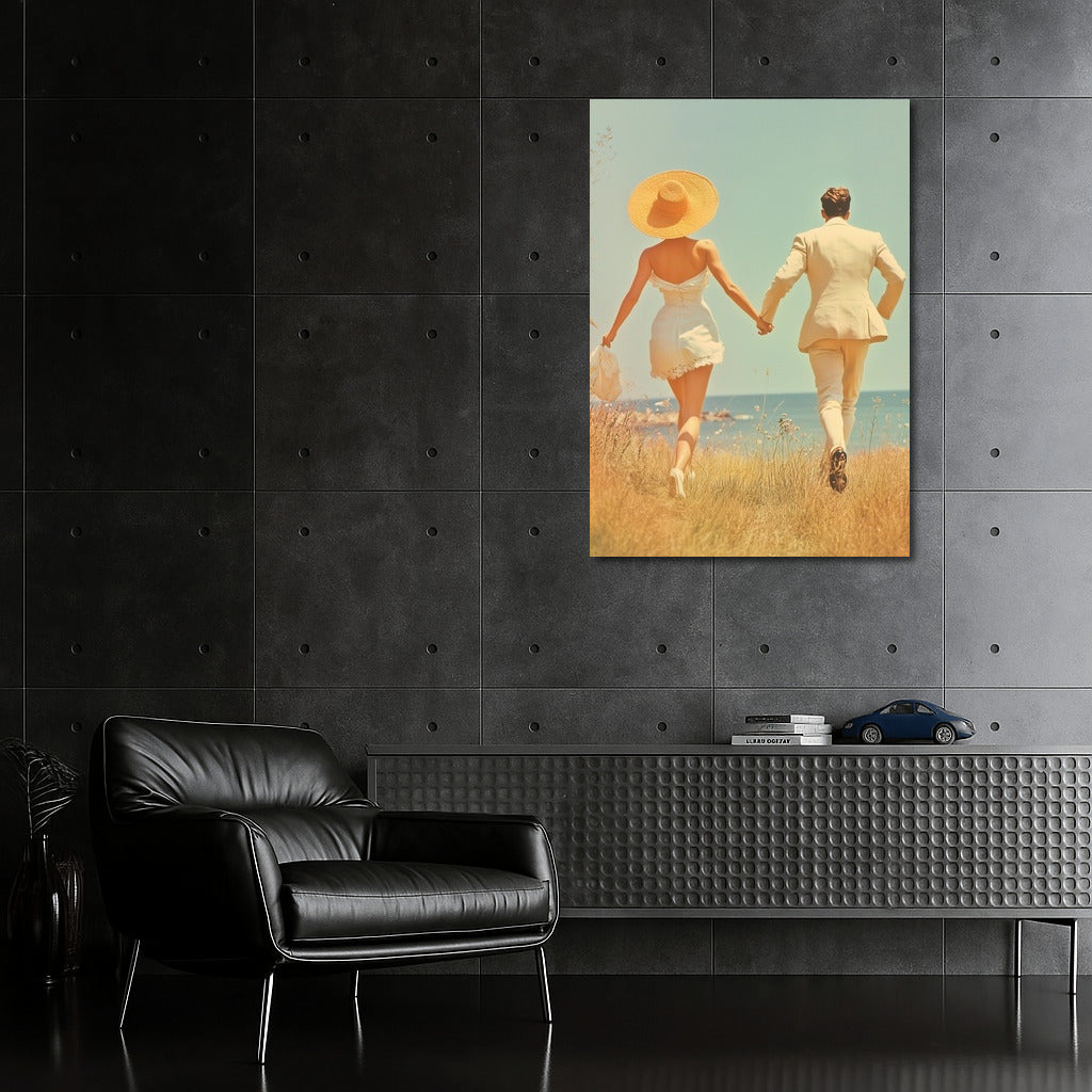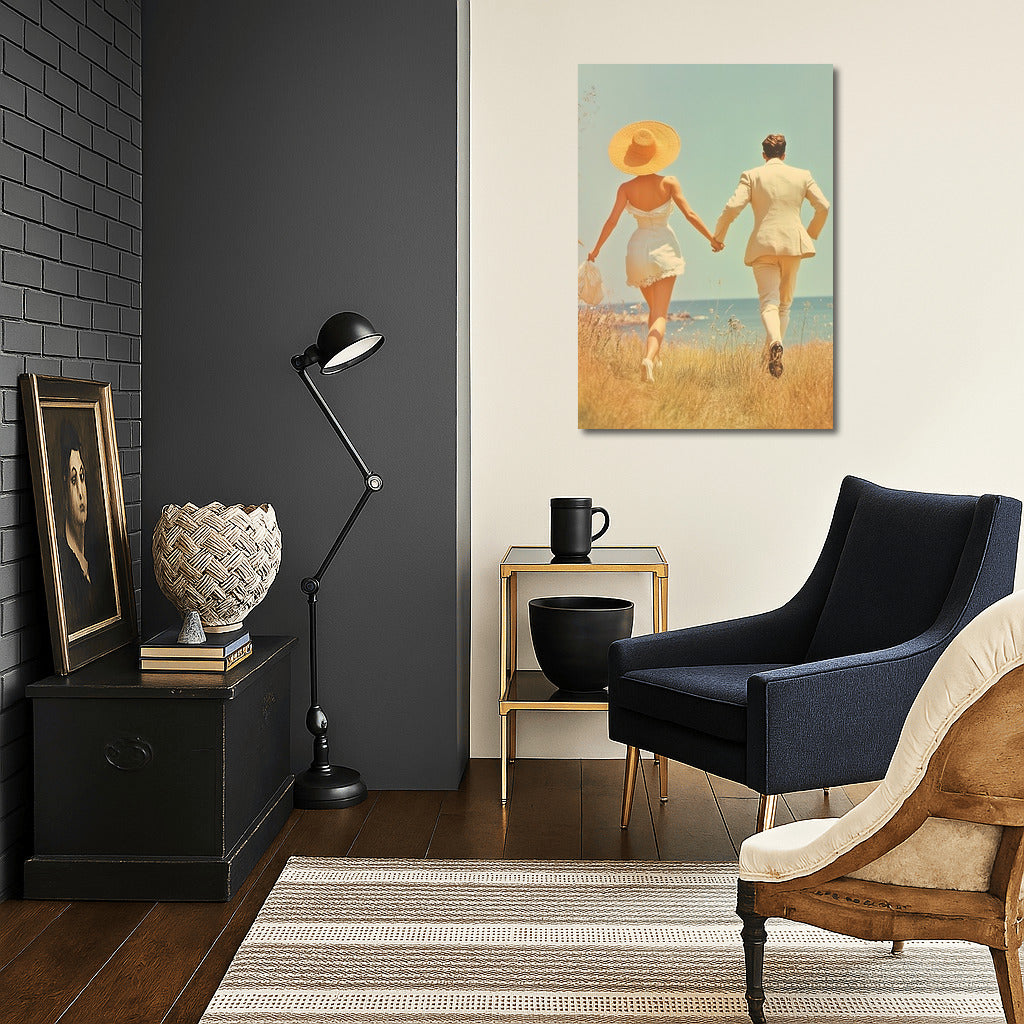 paintingsque poster: a couple in a summer style running towards the sea, embodying freedom and romance. Perfect wall art for dreamers! See more from the collection: Mixed Wall Art