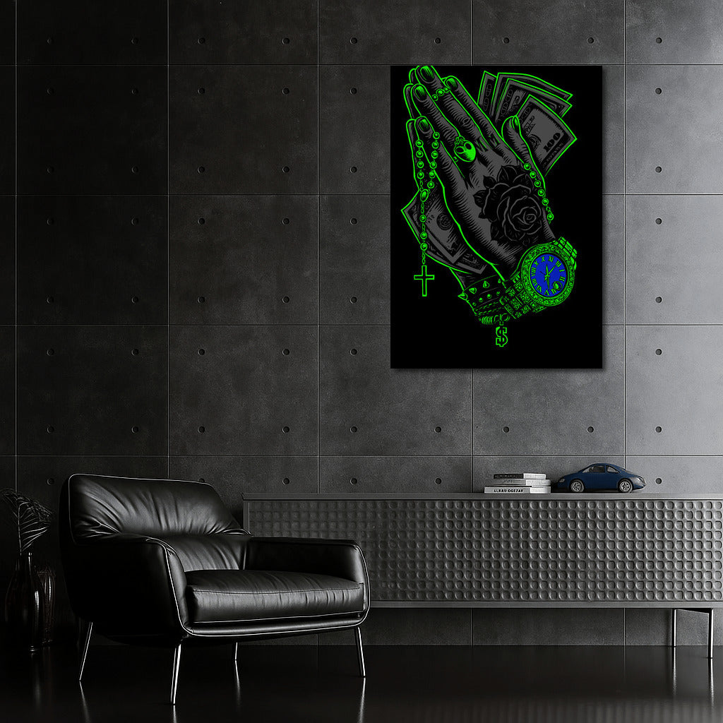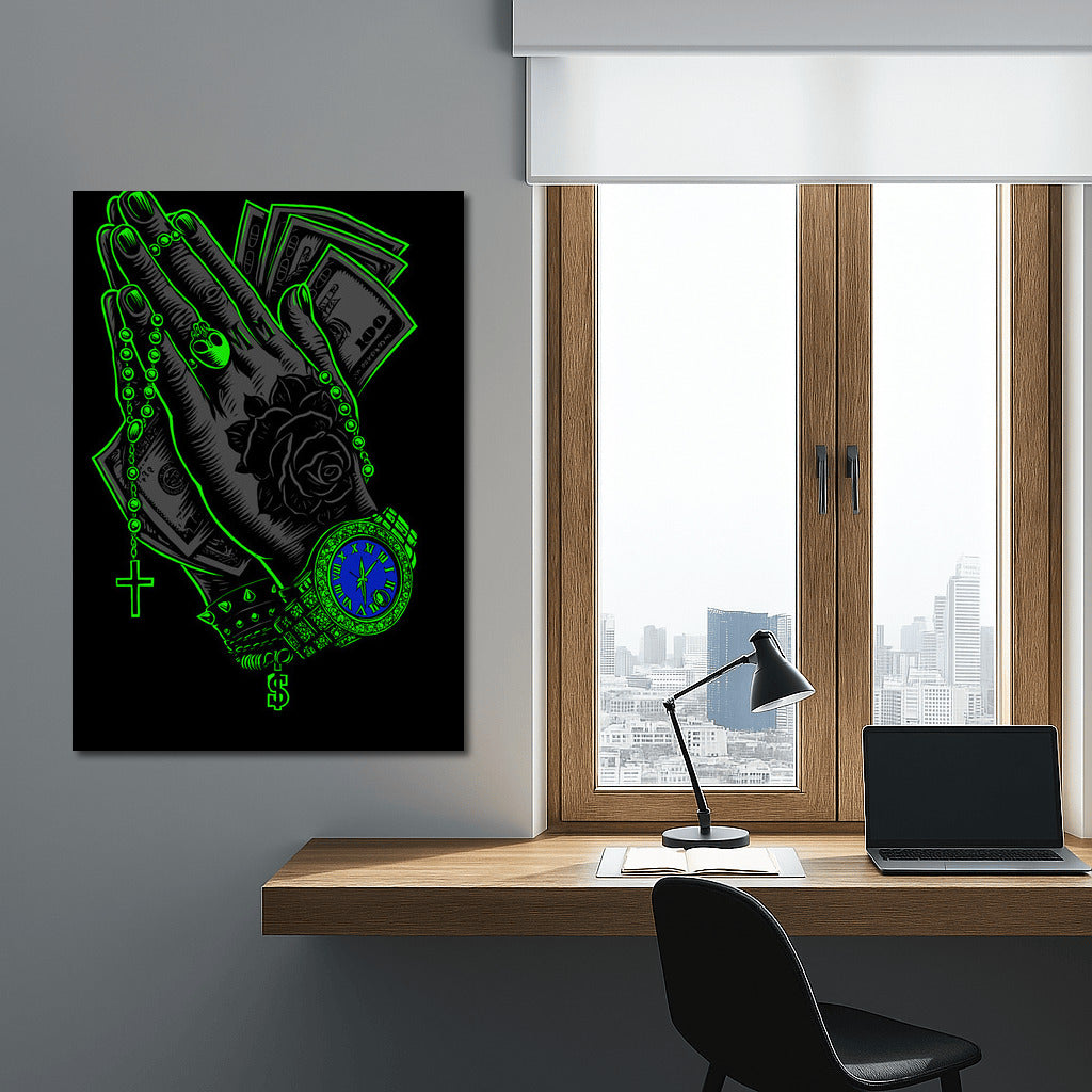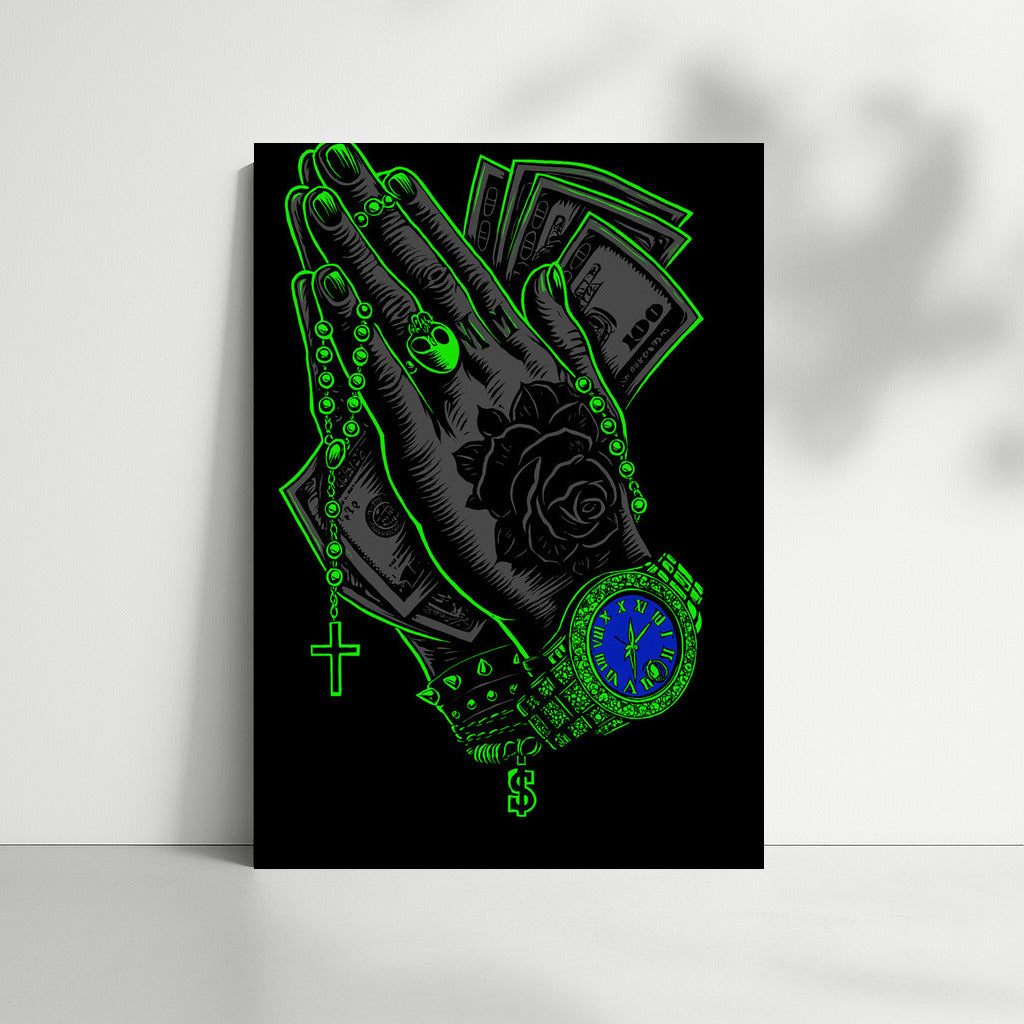 A stylish poster with a bright accent: the interweaving of luxury and faith, where money and time become part of art. See more from the collection: Money Art