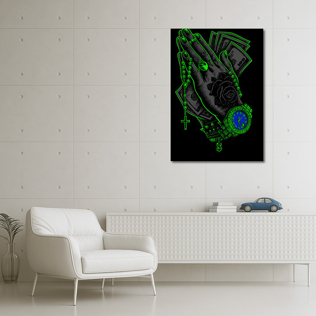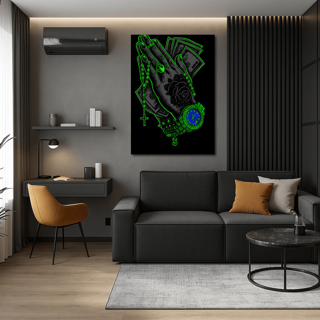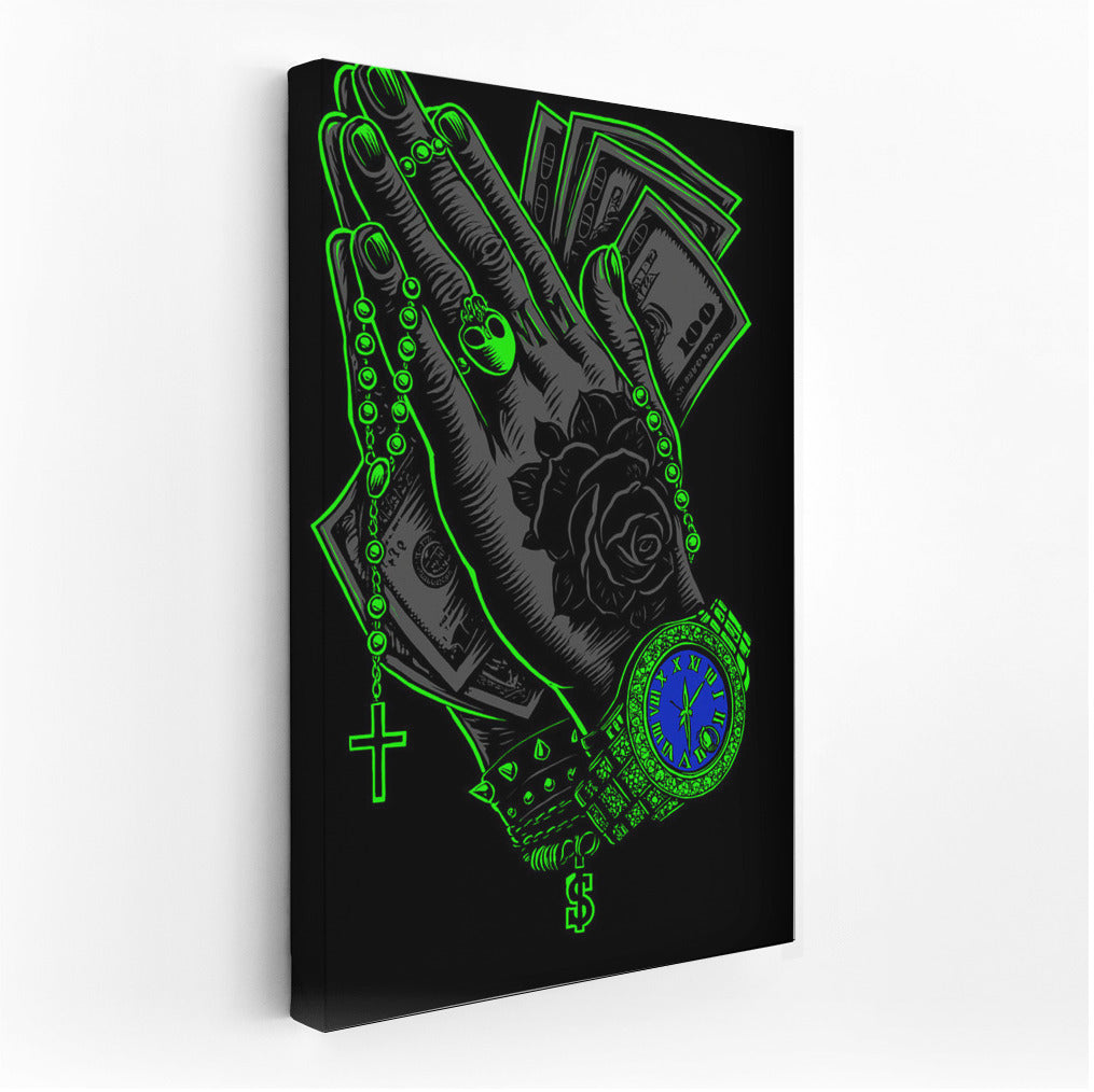 A stylish poster with a bright accent: the interweaving of luxury and faith, where money and time become part of art. See more from the collection: Money Art