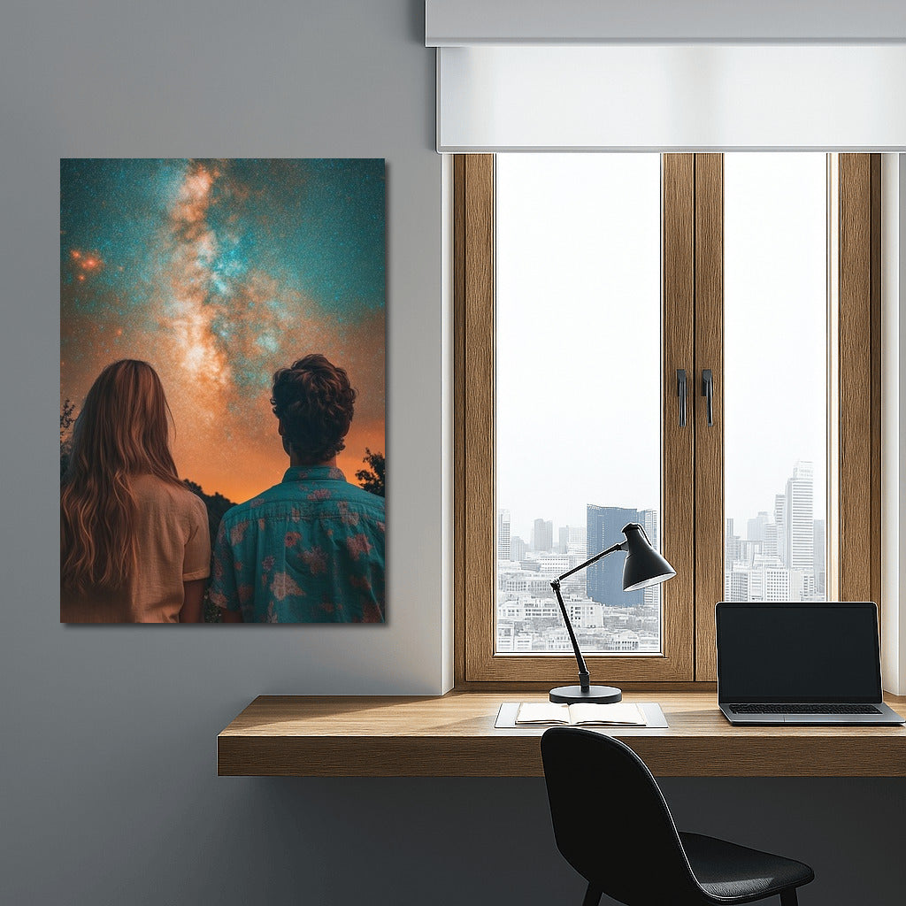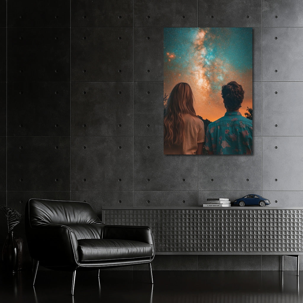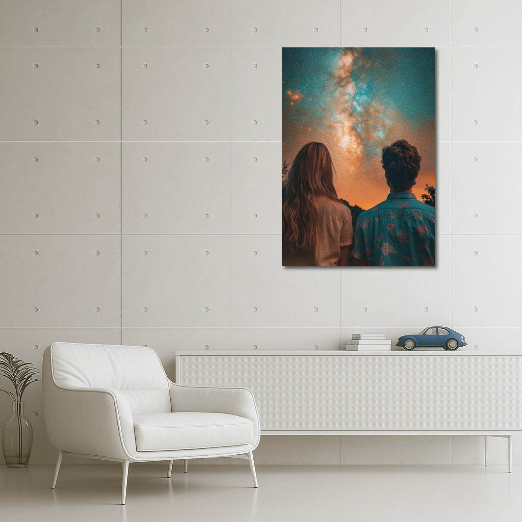 Stargazing: A poster of two people admiring the galaxy. The magic of the universe and wall art about dreams and infinity. See more from the collection: Mixed Wall Art