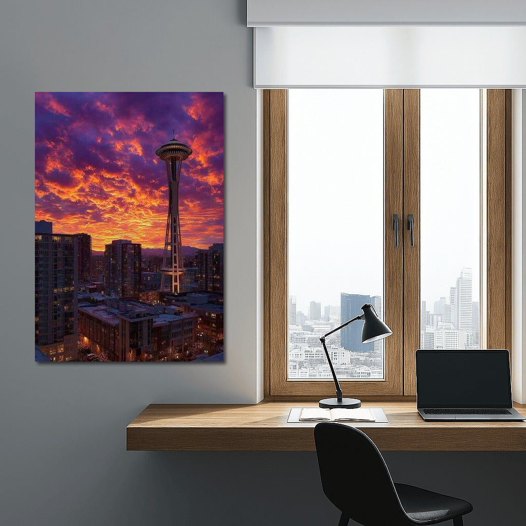 Immersive Seattle Skyline Painting: The evening sky comes alive with a colorful dance of light. Perfect wall art! See more from the collection: Cityscapes & Skylines Art
