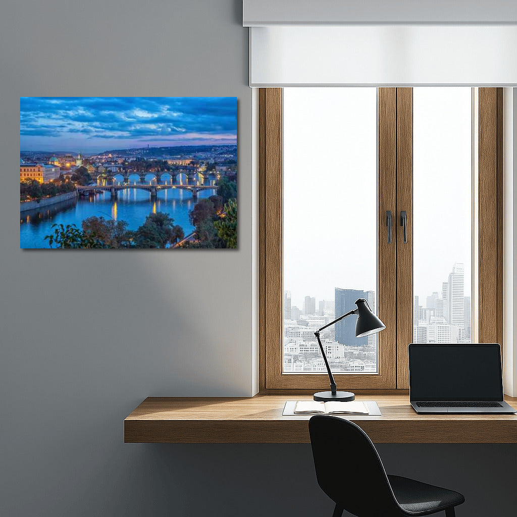 Captivating Prague Skylines painting: evening lights of bridges and towers create unique wall art in your home. See more from the collection: Cityscapes & Skylines Art