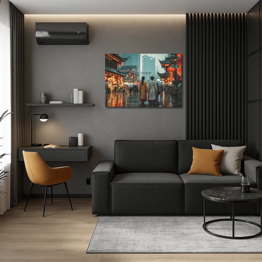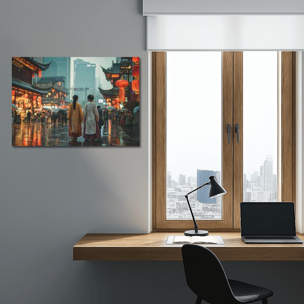 Immerse yourself in the magic of Shanghai with this wall art: an evening stroll through the colorful lights of the cityscape. See more from the collection: Cityscapes & Skylines Art