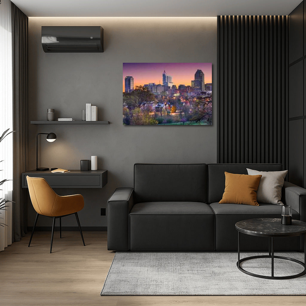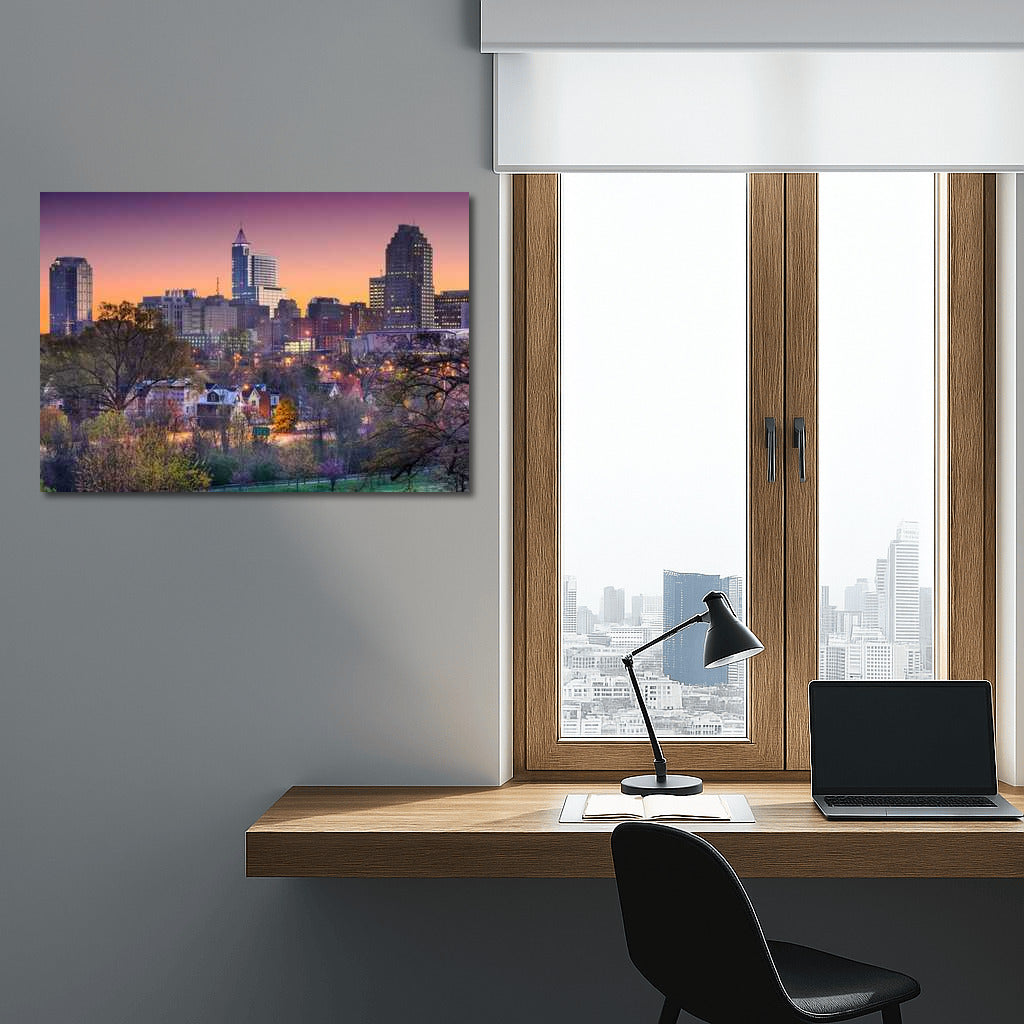 Evening Riley: A poster of a North Carolina cityscape where skyscrapers meet soft pastel skies. See more from the collection: Country Art