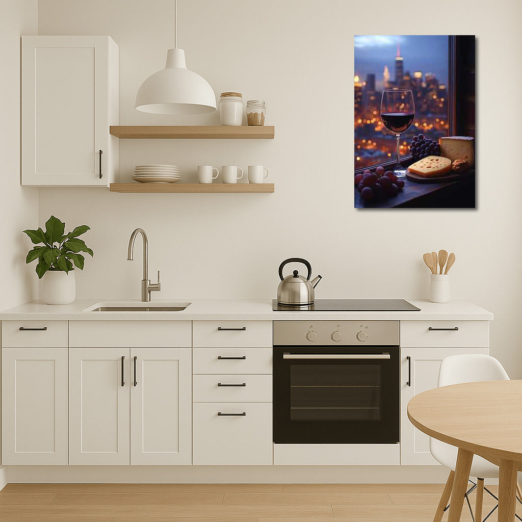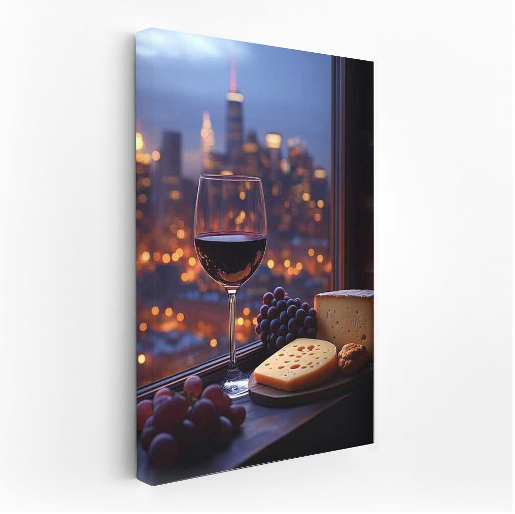 Wall art: a cozy evening with wine and cheese against the backdrop of the evening city. The perfect addition to create a homey feel. See more from the collection: Food Art