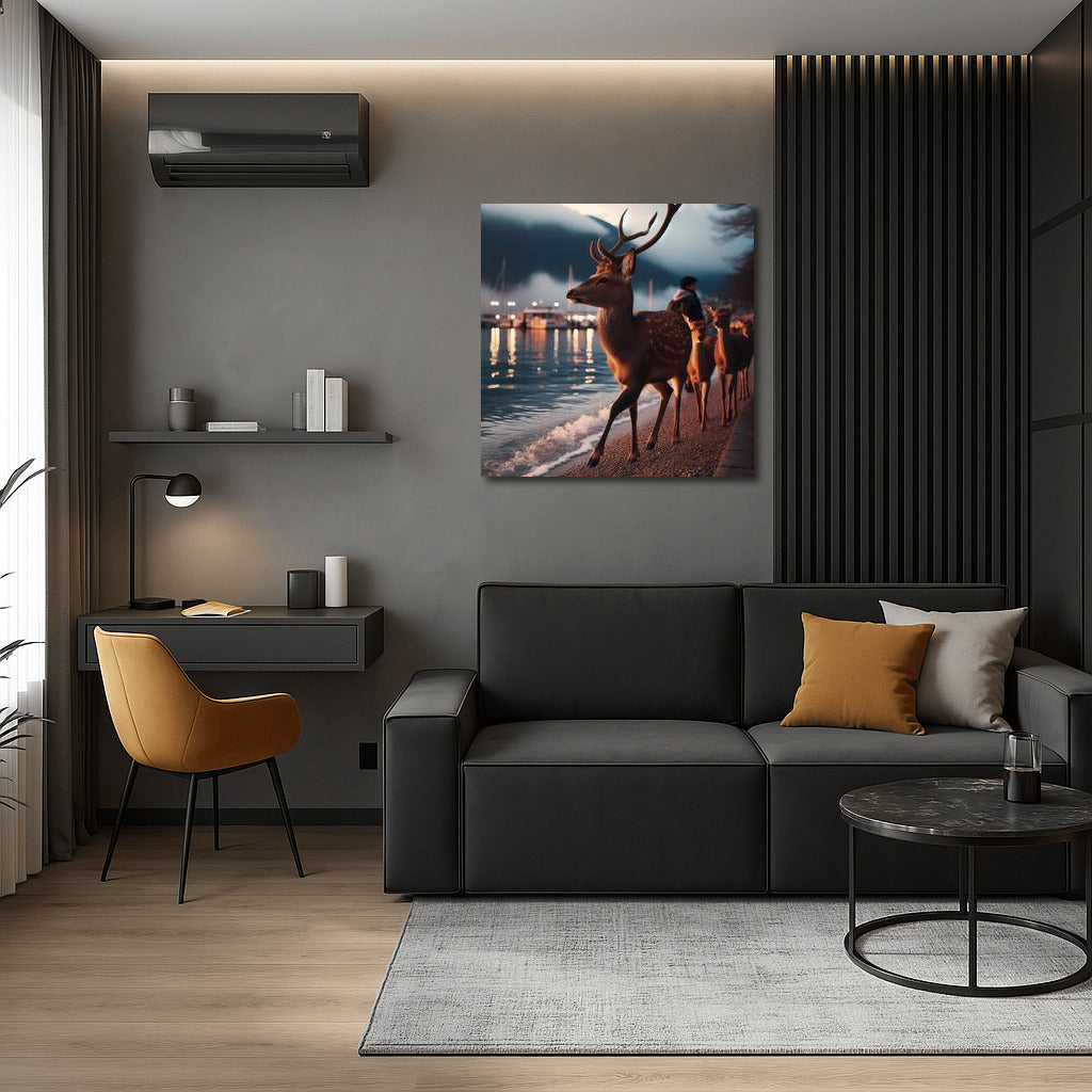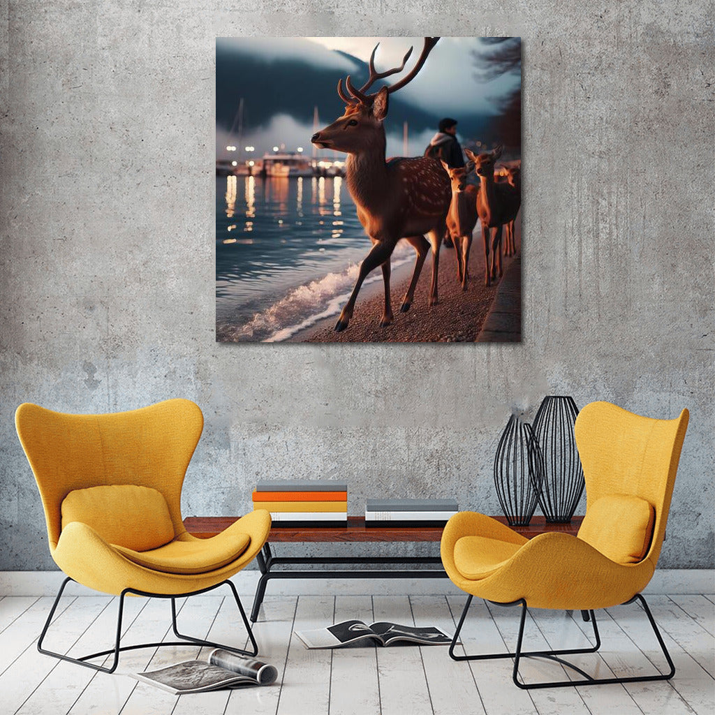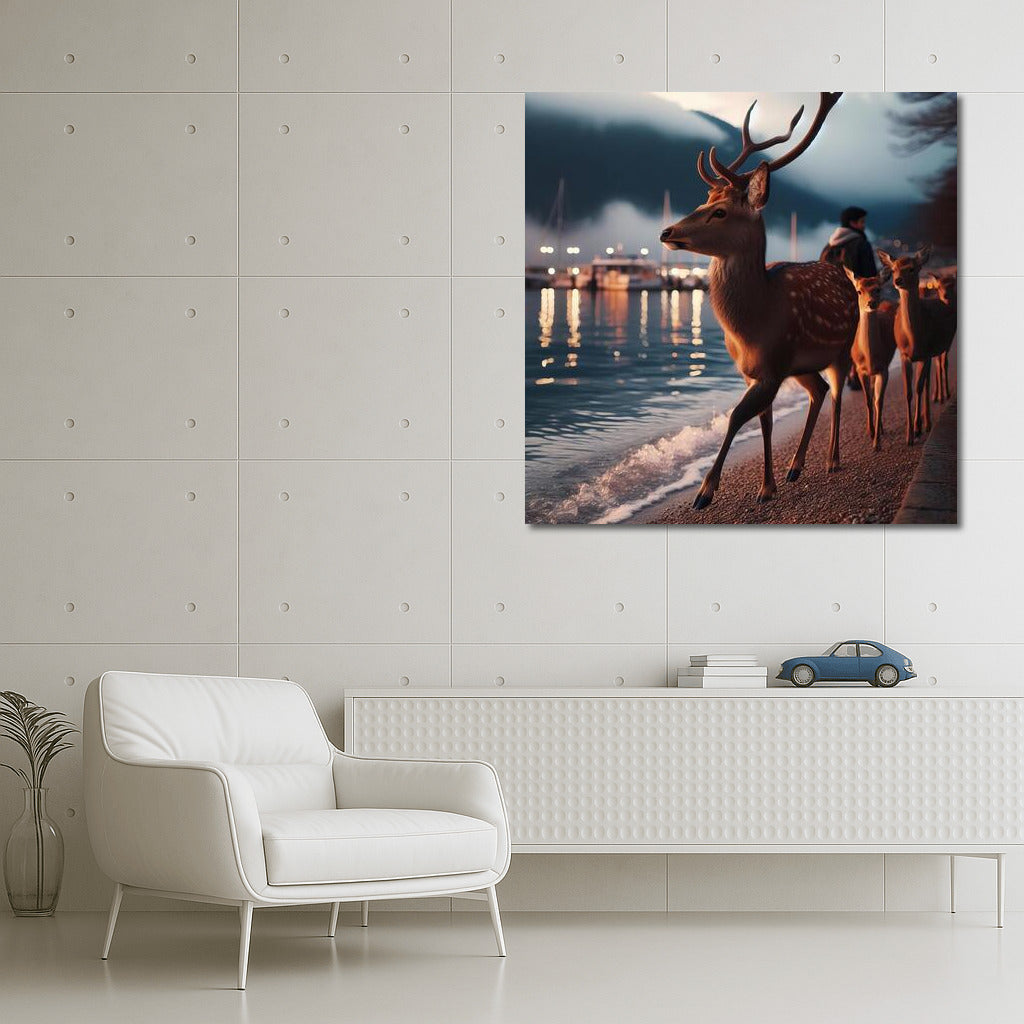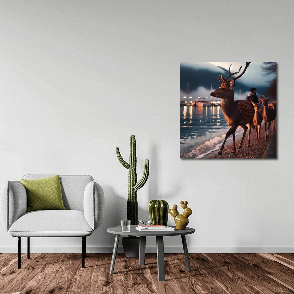 Immerse yourself in the magic of the evening: a poster of a deer gracefully walking along the embankment will enliven any wall space. See more from the collection: Animals Art
