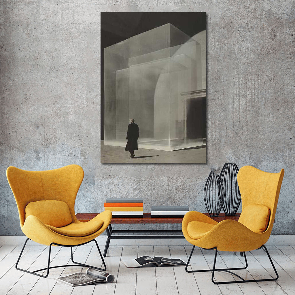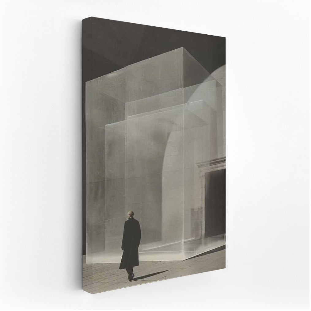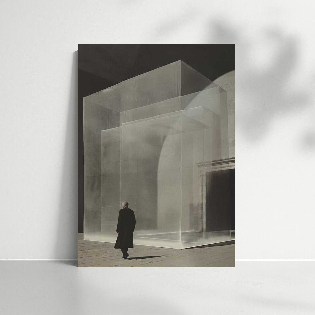 Surreal isometric cube poster. Man explores mysterious black and white world. Art that inspires. See more from the collection: Surreal Art