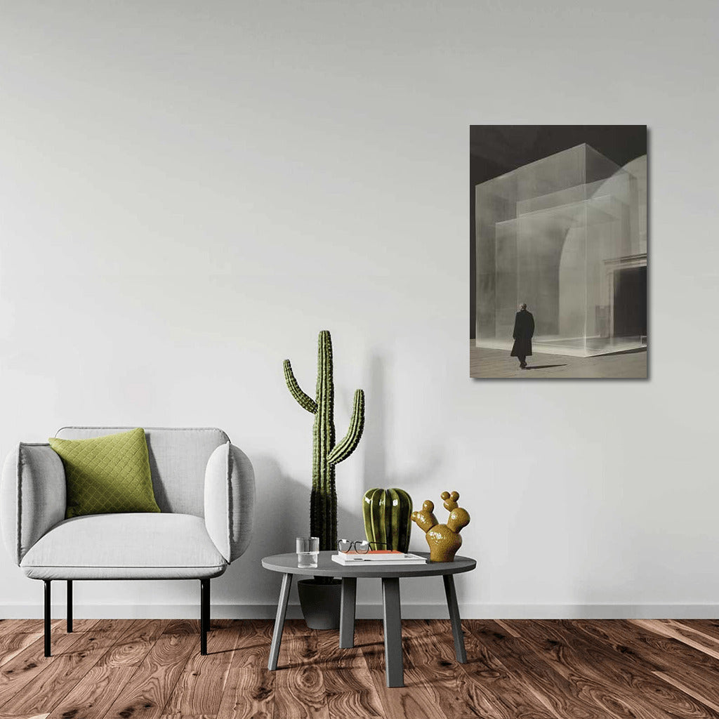 Explorer in Black and White Isometric Cube: Surreal Journey Wall Art