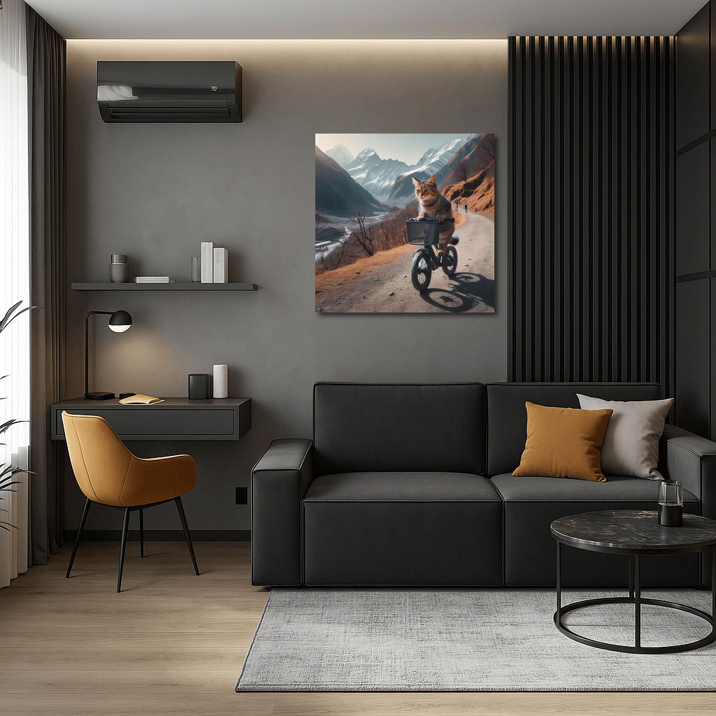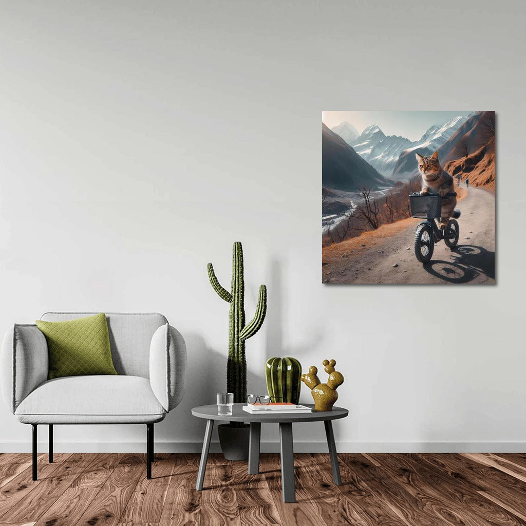 A cat on a bicycle conquers a mountain route. This poster will add mischief and dynamics to any space! See more from the collection: Animals Art