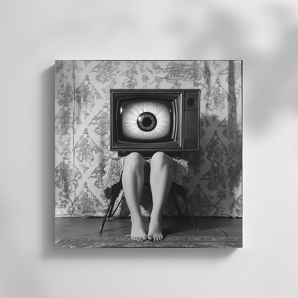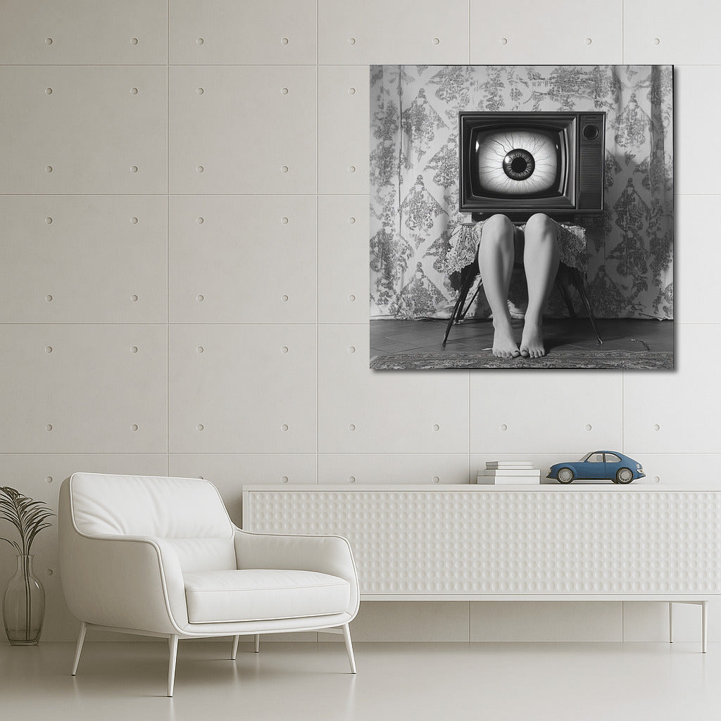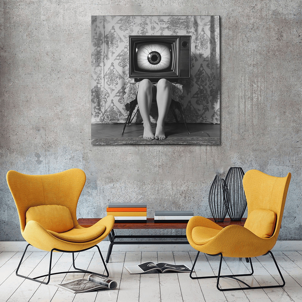 Surrealism poster: a mysterious scene with a TV and eyes, immersing you in a fantasy world. Wall art will add mystery to the interior. See more from the collection: Surreal Art