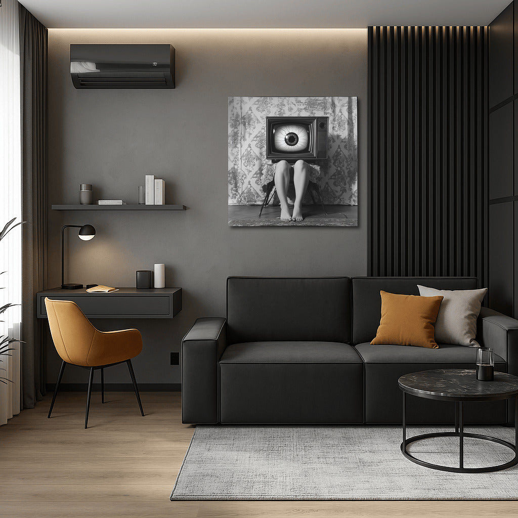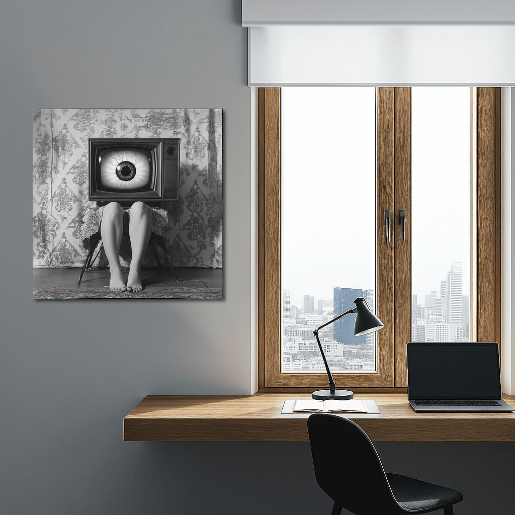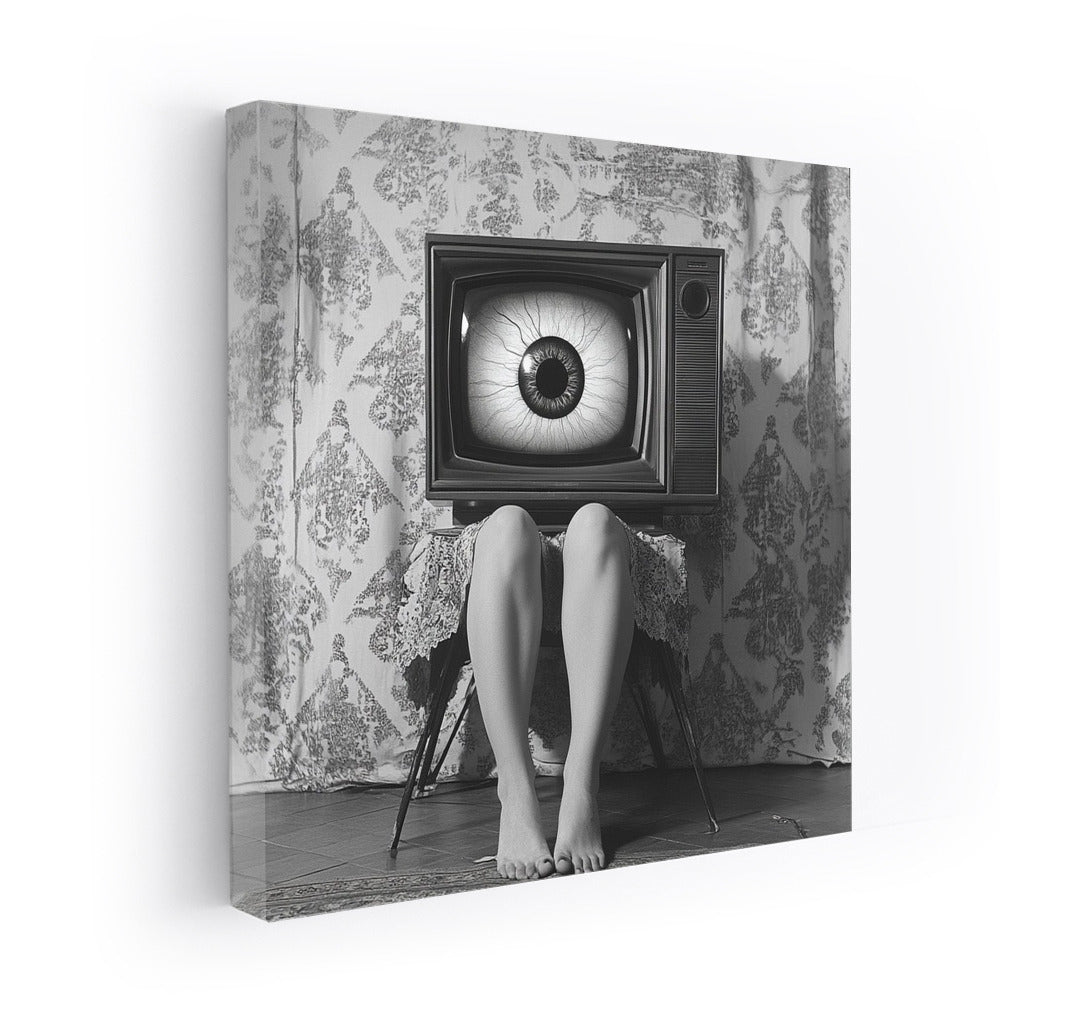 Surrealism poster: a mysterious scene with a TV and eyes, immersing you in a fantasy world. Wall art will add mystery to the interior. See more from the collection: Surreal Art